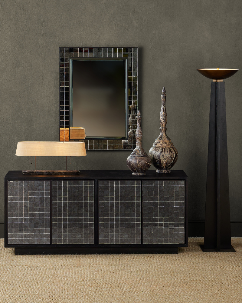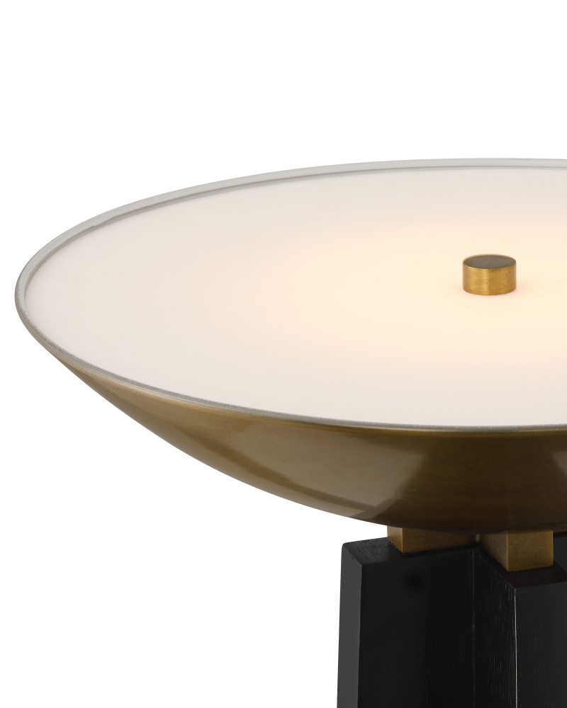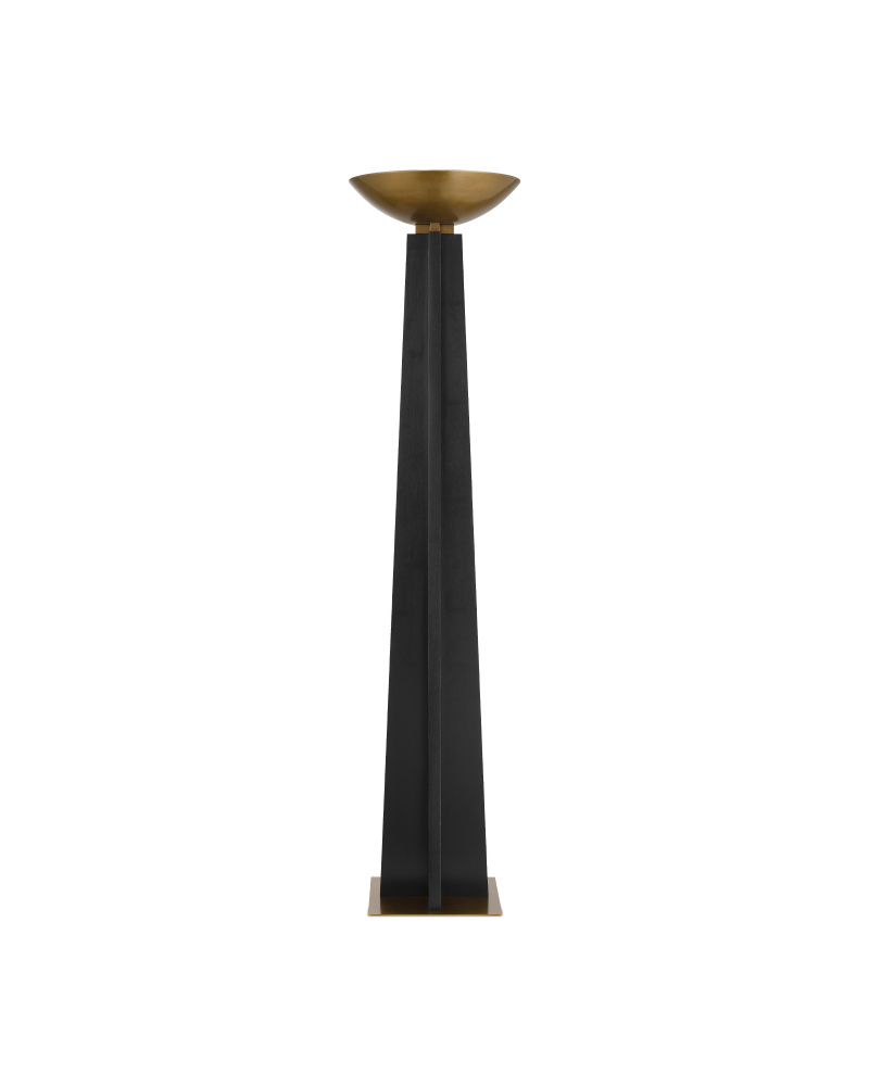 The Calyx Torciere Floor Lamp is made of rubberwood with pitting on its surface that brings patina to the telescoping body. Also contributing to the textural feel is that the black finish has been rubbed away on the edges on the cross-shaped form. The black floor lamp sits on a minimal metal base in an antique brass finish that matches the bowl holding the integrated LED light source.