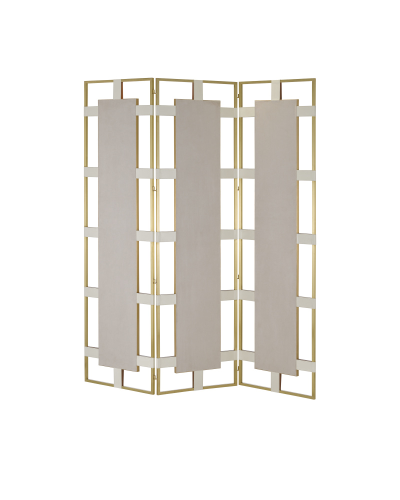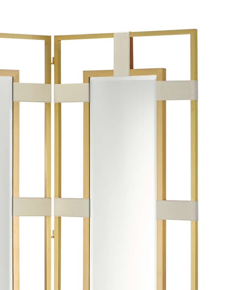 Classically modern, the Camille Brass Screen has a smart juxtaposition of materials that includes Grade-A leather and brass. Cream leather straps wrap around thin rectangles of brass to form the frame of this gold room screen.
