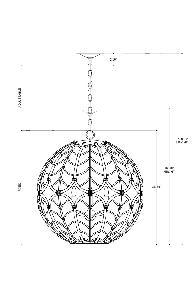 The Cape Verde Orb Chandelier is a stunning design inspired by the intricate patterns of a Lalique glass bowl. The round rattan chandelier features a woven shade that echoes the etched pattern of the glass, creating a sense of true harmony. The hardware is finished in a mix of silver leaf and smoke wood, adding to the chandelier's refined aesthetic. This design beautifully combines natural materials with elegant craftsmanship. Adjustable from 32" to 100" with use of included chain/rod kit/cable. If your space calls for a longer drop, additional chain/rods/cable is available for purchase.