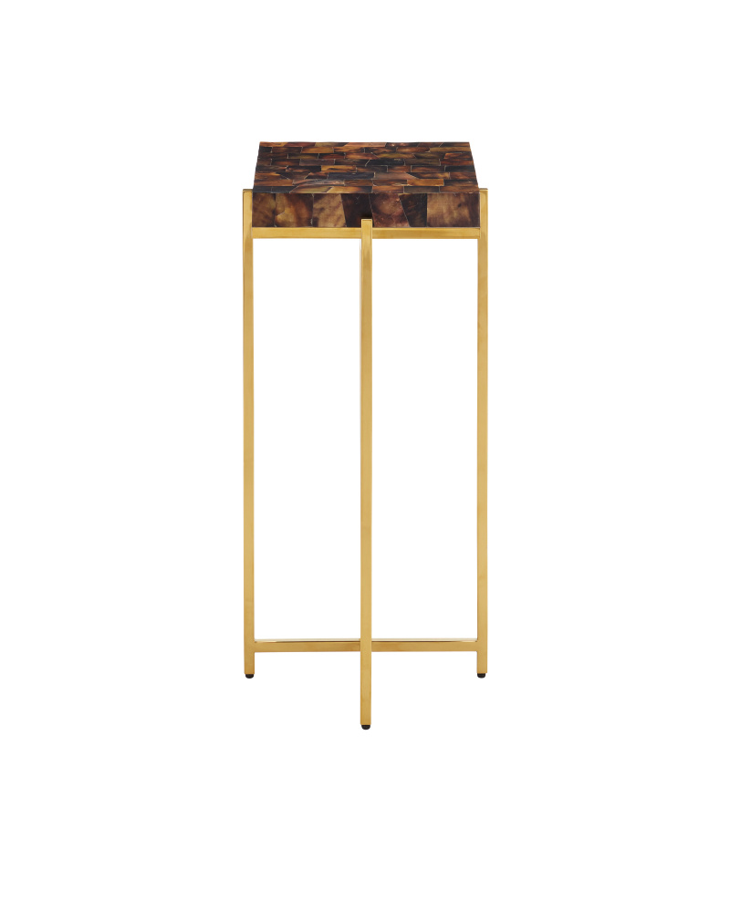 The exquisite placement of pieces of natural shell makes the Casey Penshell Brown Accent Table a fine example of true artisanship. The top is covered in a mosaic of shells that were expertly placed to cover the rectangular slab, which is inset into the metal frame like a gem. Four legs made of stainless steel in a warm brass finish are connected by an ex-shaped stretcher. The gold and mottled brown drinks table stands just over 23 inches tall.