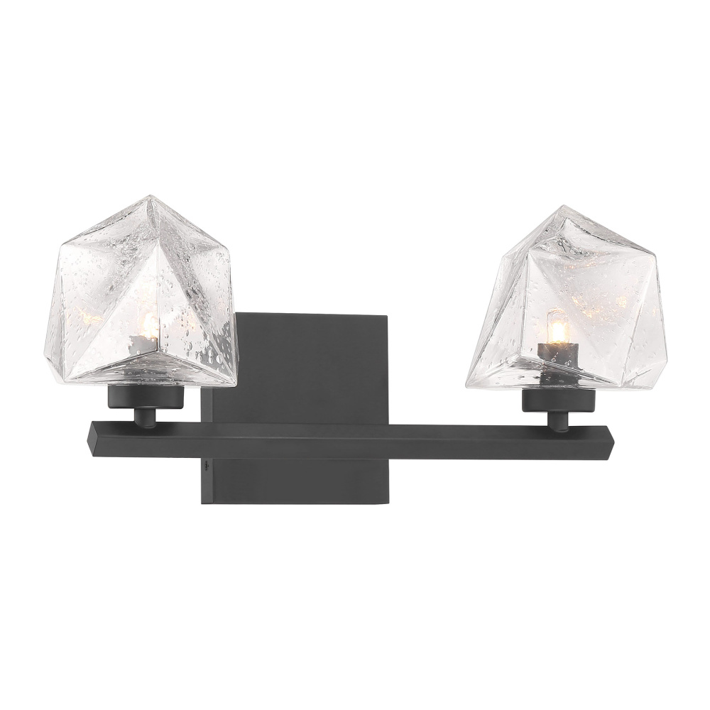 The Castello 2-light bath light from Savoy House is cool as ice! Its sharply cut shades of clear hammered glass add a bright touch of geometry and texture, pairing perfectly with the thick arm and backplate that is finished in Black. Castello is 6.5" in height, 15" in width and extends 6.5" from the wall. Uses two LED G9 bulbs. Bulbs not included.