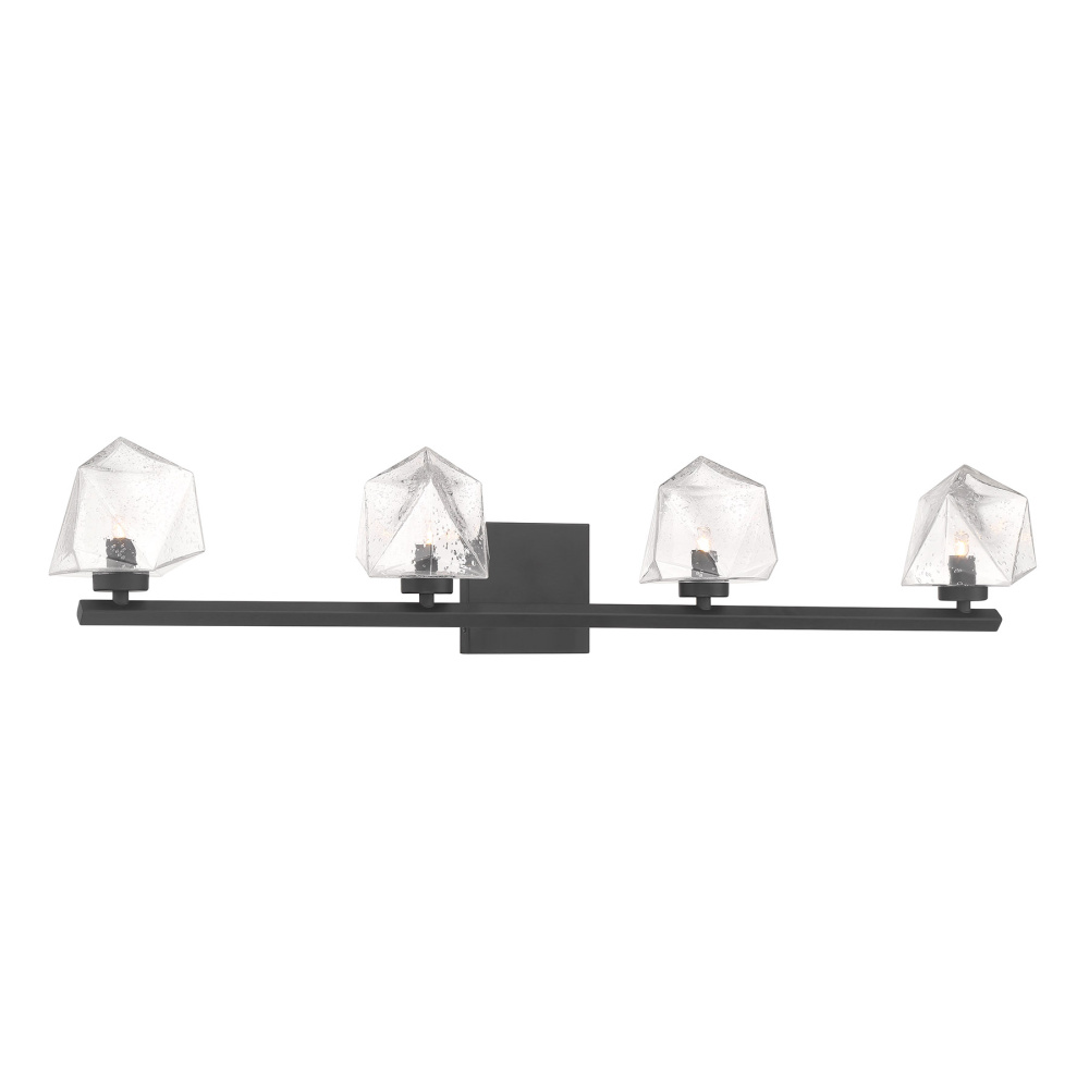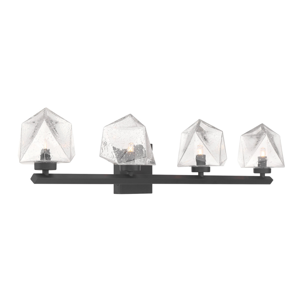 The Castello 4-light bath light from Savoy House is cool as ice! Its sharply cut shades of clear hammered glass add a bright touch of geometry and texture, pairing perfectly with the thick arm and backplate that is finished in Black. Castello is 6.5" in height, 35" in width and extends 6.5" from the wall. Uses four LED G9 bulbs. Bulbs not included.