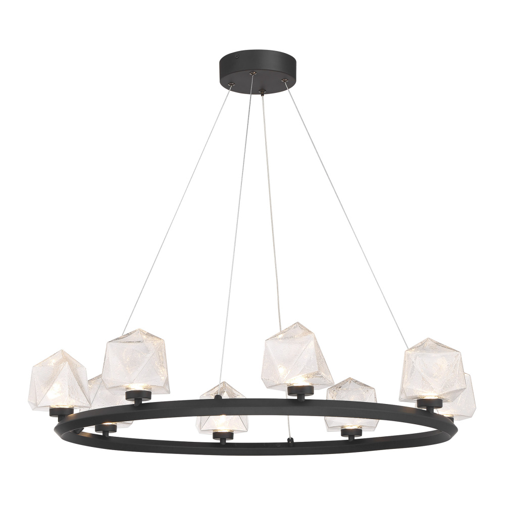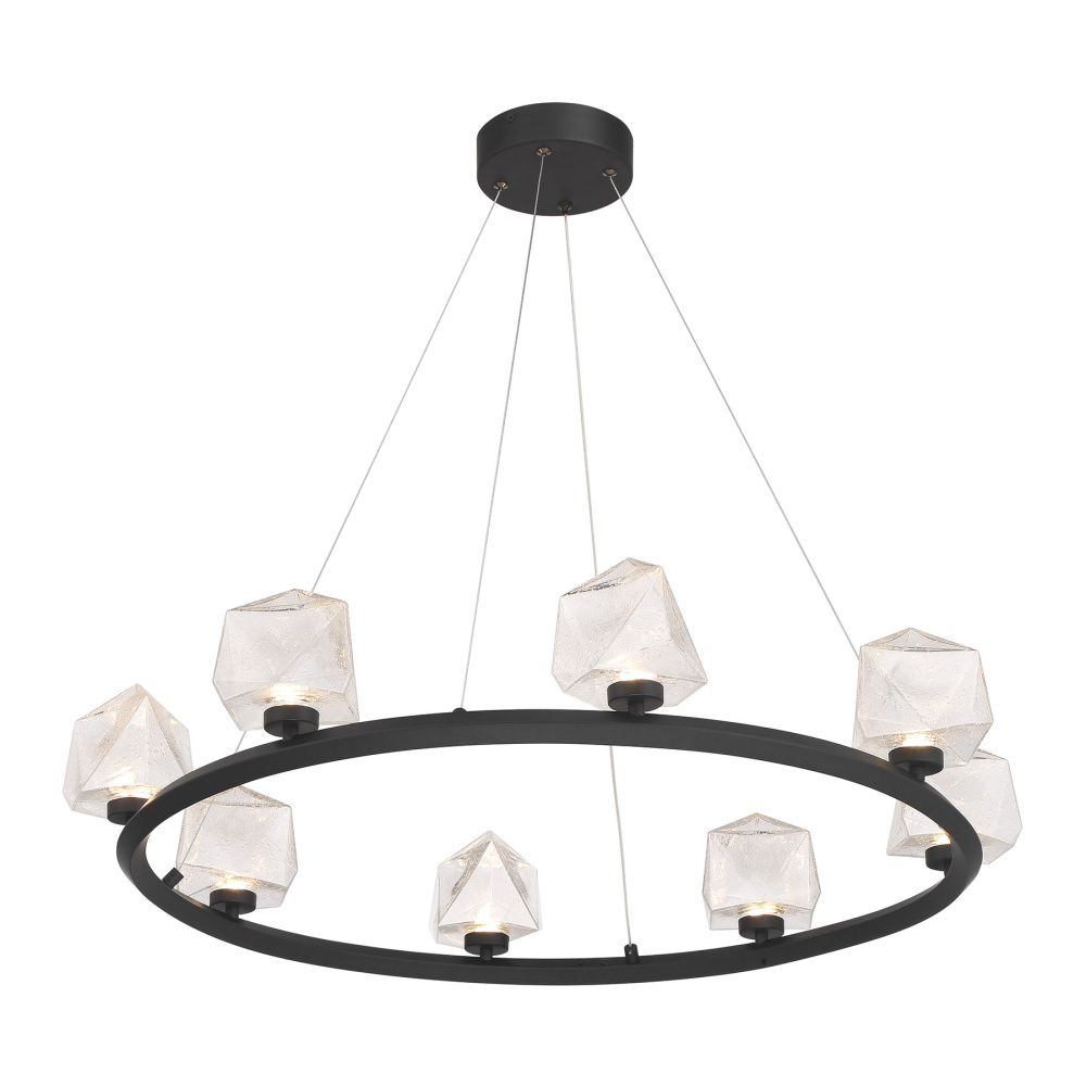 The Castello 8-light chandelier from Savoy House is cool as ice! Its sharply cut shades of clear hammered glass add a bright touch of geometry and texture, pairing perfectly with the thick hoop-shaped structure that is finished in Matte Black. When the glass is illuminated by the integrated LED light sources, it will truly shine. Super slender hanging cords ensure that your attention stays on the sleek, contemporary design. Castello is 33.63" in width and has an adjustable height ranging from 6" to 126".
