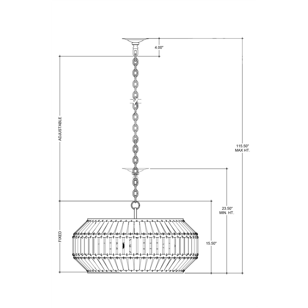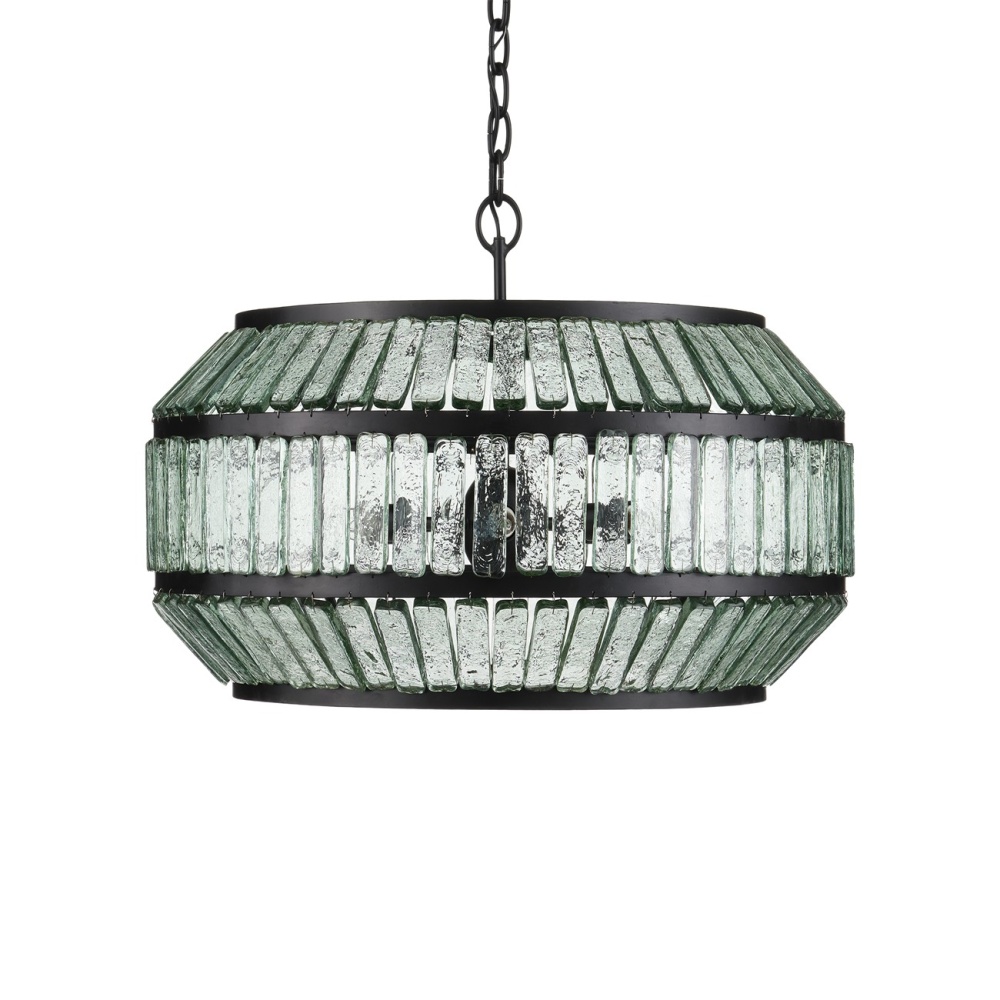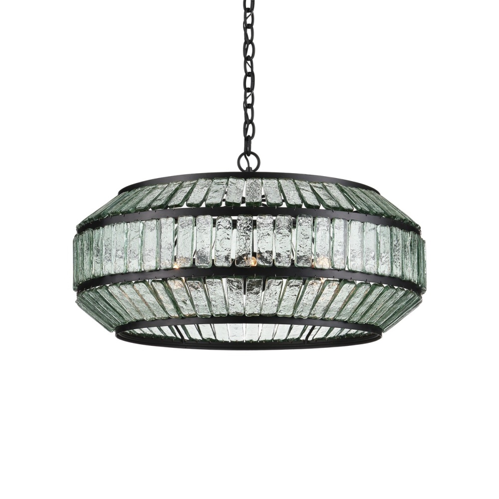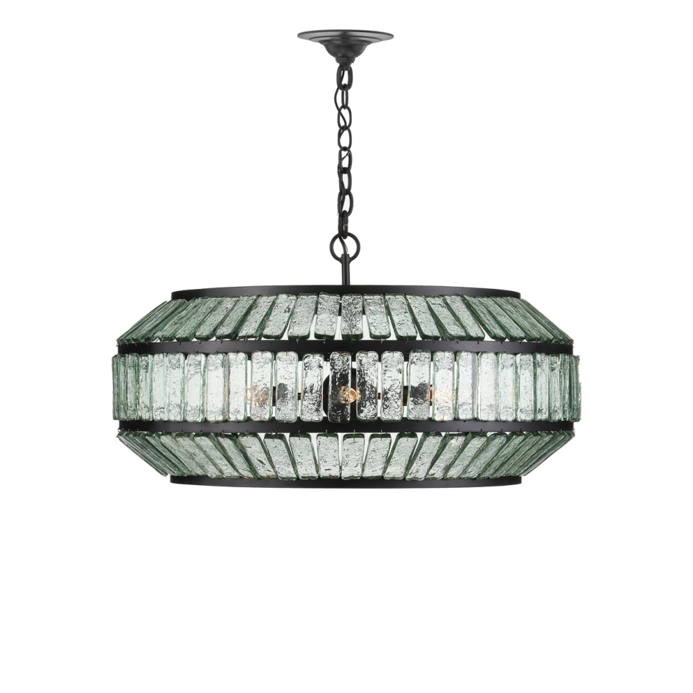 The Centurion Chandelier has elongated recycled glass panes that are unobtrusively fitted into wrought iron rings in a satin black finish. The thinness of the wire that fastens them makes this design feel streamlined and the wavy surfaces of the pieces of glass make it luminous. This black chandelier is stylistically suited to modern farmhouse, traditional, and transitional interiors. Adjustable from 23.5" to 115.5" with use of included chain/rod kit/cable. If your space calls for a longer drop, additional chain/rods/cable is available for purchase.