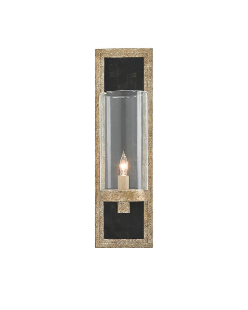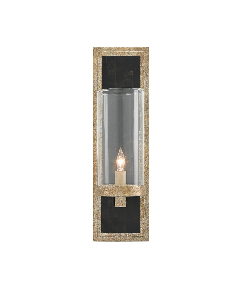 Our Charade Silver Wall Sconce has vintage appeal with its wrought iron wall plate trimmed in an antique silver leaf finish. Inset into its frame is a stylish panel of black Penshell Crackle. This fixture is certified for damp locations. The Charade is also available in a contemporary gold leaf finish.