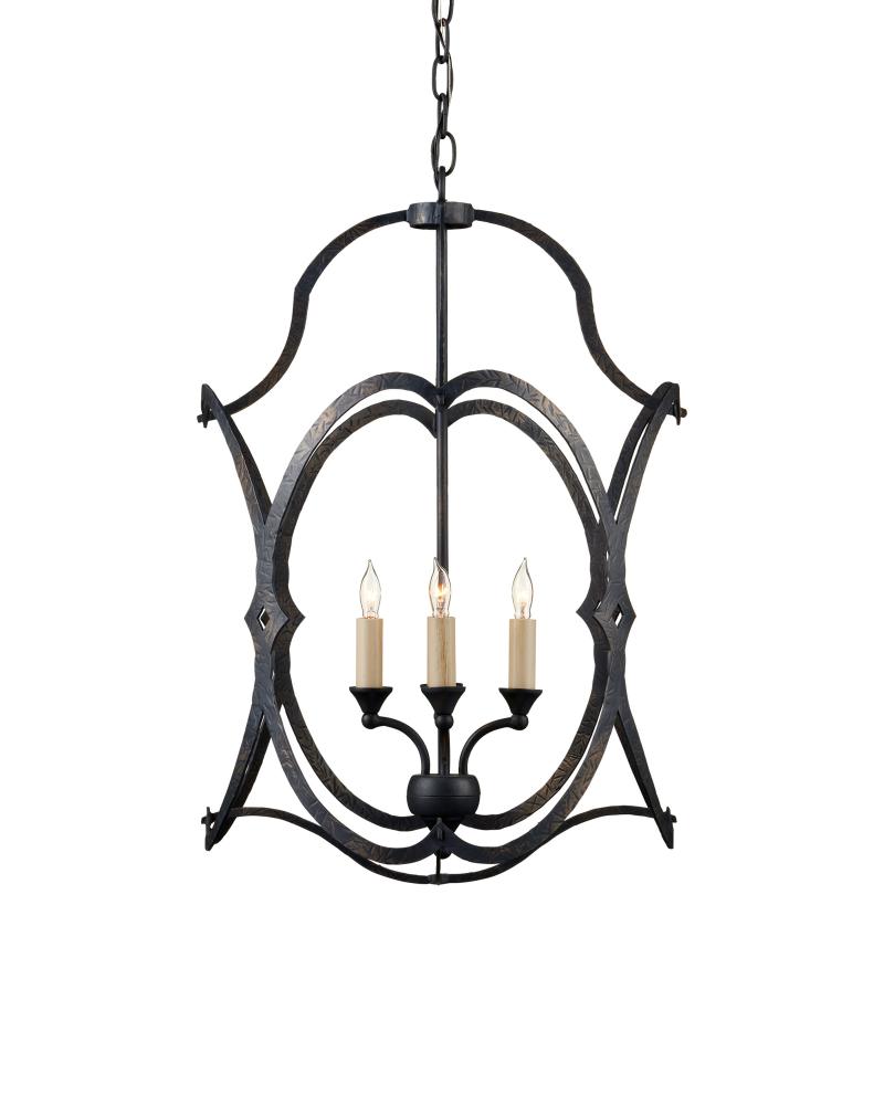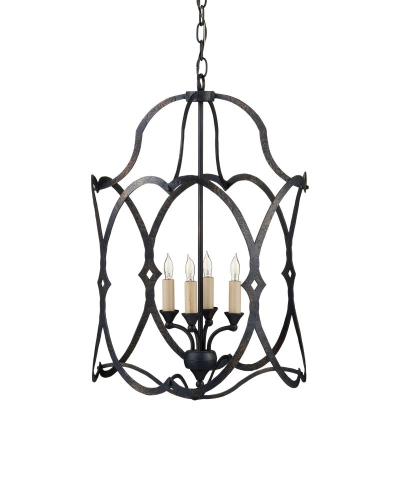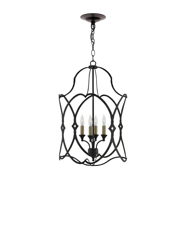 This exquisite work of wrought iron twists and turns to deliver a lithesome shape treated to a lovely French black finish. Where the arcing ovals meet, tiny diamond shapes bring added charm to the four-light fixture. This small version of the Charisma Lantern invites classic Italian flair into interiors. We offer this fixture in a larger lantern that has just as winsome a personality as this design does.