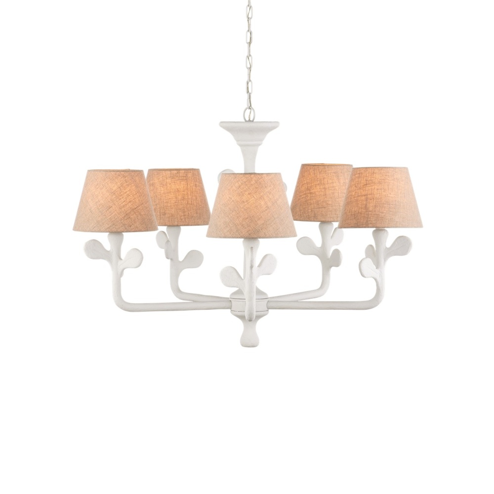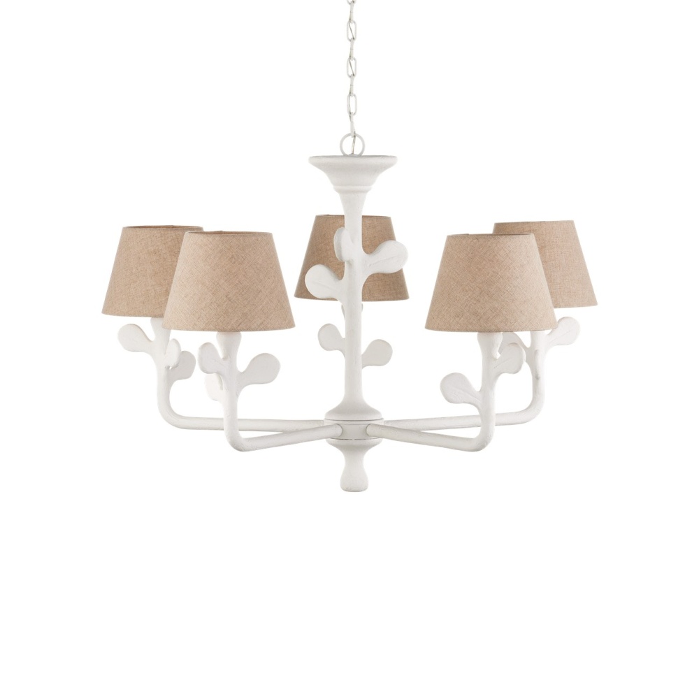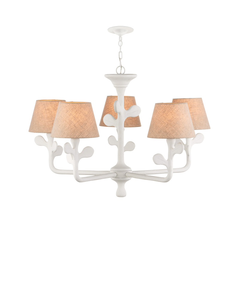 The playful profile of the Charny Chandelier makes this a charming addition to a room. The white chandelier is made of composite with a White Gesso finish. The leaf-like shapes that extend from the stems of the Charny make this a terrific luminary for a space inspired by nature. The textural natural shades made of coarse linen add a dash of warmth to the design. Adjustable from 35" to 103" with use of included chain/rod kit/cable. If your space calls for a longer drop, additional chain/rods/cable is available for purchase.