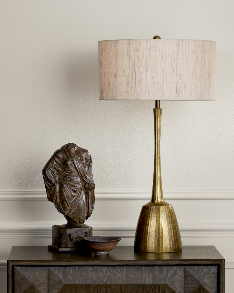 A nod to brutalist style with a gleaming antique brass finish, the Cheenee Table Lamp has a powerful silhouette. The gold table lamp has a long neck that subtly narrows in the middle, and the entire composition is striated with chisle marks in between the lines to bring added texture to the sculptural profile. Adding to this is the natural linen shade with its subtle striations.