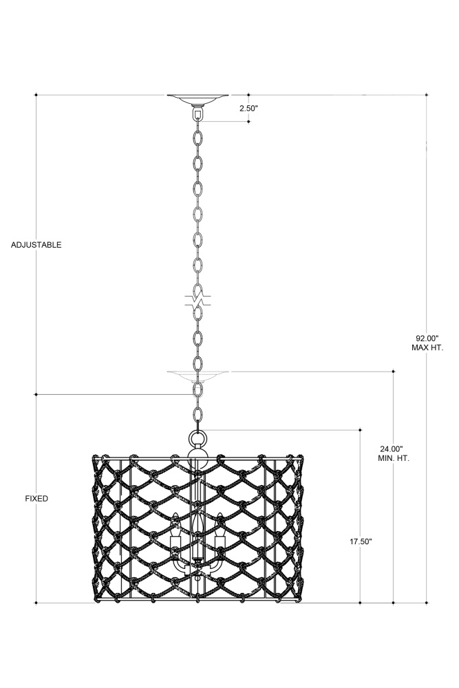 Made of wrought iron in a smoke wood finish and natural abaca rope, the Chesapeake Chandelier is a drum chandelier with an open and airy feel thanks to the loose looping of the material between the top and bottom rings of the shade. The nautical chandelier illustrates the skill of our artisans, as the rope is hand-knotted and hand-tied to the frame, painstaking efforts that result in an artisanal light fixture. Adjustable from 24" to 92" with use of included chain/rod kit/cable. If your space calls for a longer drop, additional chain/rods/cable is available for purchase.