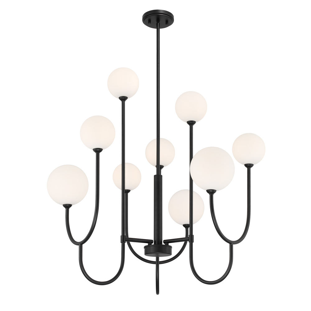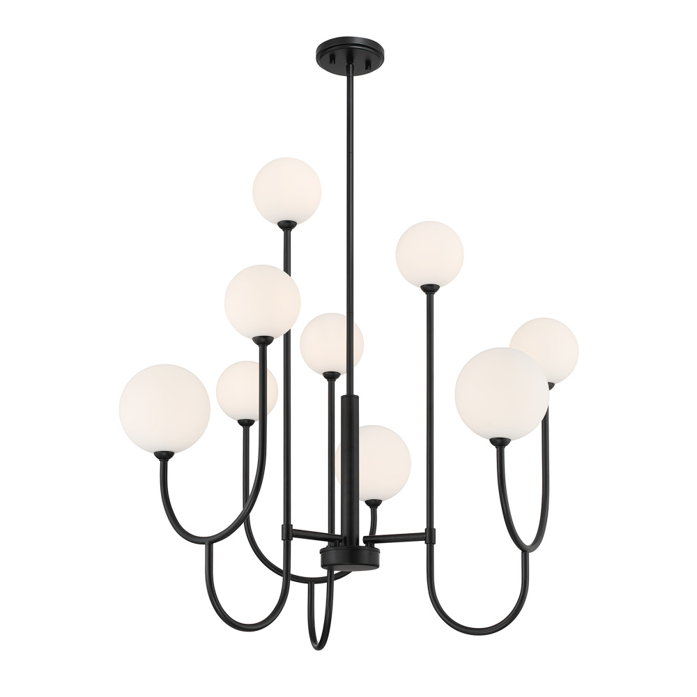 Bring a bold take on bubbly Art Deco style to your space with the Savoy House Chester 9-light chandelier. Curving arms support orbs of white opal glass in two different sizes for a dynamic geometric effect. A Matte Black finish adds striking contrast. Chester is 30" in width and has an adjustable height ranging from 34.75" to 70.75". It uses nine G9 bulbs of up to 60 watts per bulb. Bulbs not included. Comes with four 12" downrods and one 6" downrod.