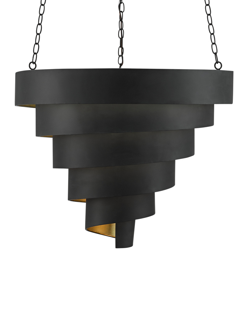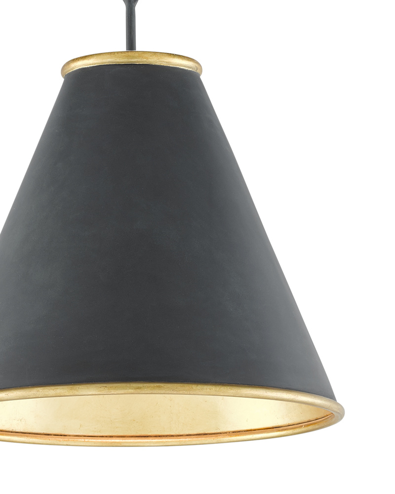 The Chiffonade Large Pendant has an elegant fluidity to its lines that curl downward to end with a lovely swirl. Made of wrought iron in an antique black finish, the black pendant has a contemporary gold finish on the interior of the shade that brings a warm glow to its illumination. Adjustable from 31.75" to 99.75" with use of included chain/rod kit/cable. If your space calls for a longer drop, additional chain/rods/cable is available for purchase.