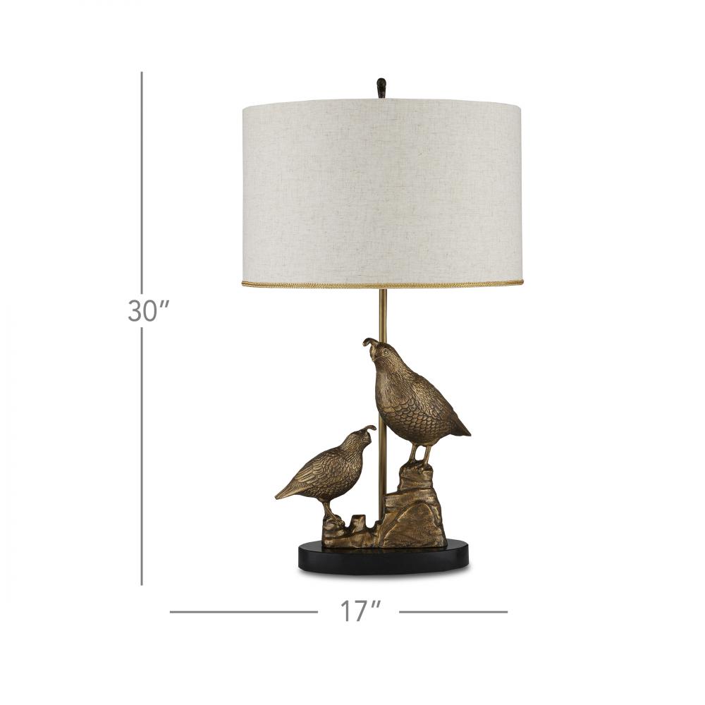 When Marjorie Skouras designed the Codorniz Brass Table Lamp, she was inspired by the Mexican quail that roam the meadows and woods of the Yucatan Peninsula that she calls home. The pair of quail and the rocky ledge on which they are perched are fashioned from cast aluminum in an antique brass finish. The black marble base is honed rather than polished and the natural linen shade with gold foil lining has glimmering gold trim on its top and bottom edges. A whimsical design detail is the finial that is shaped like a quail's head-feather.