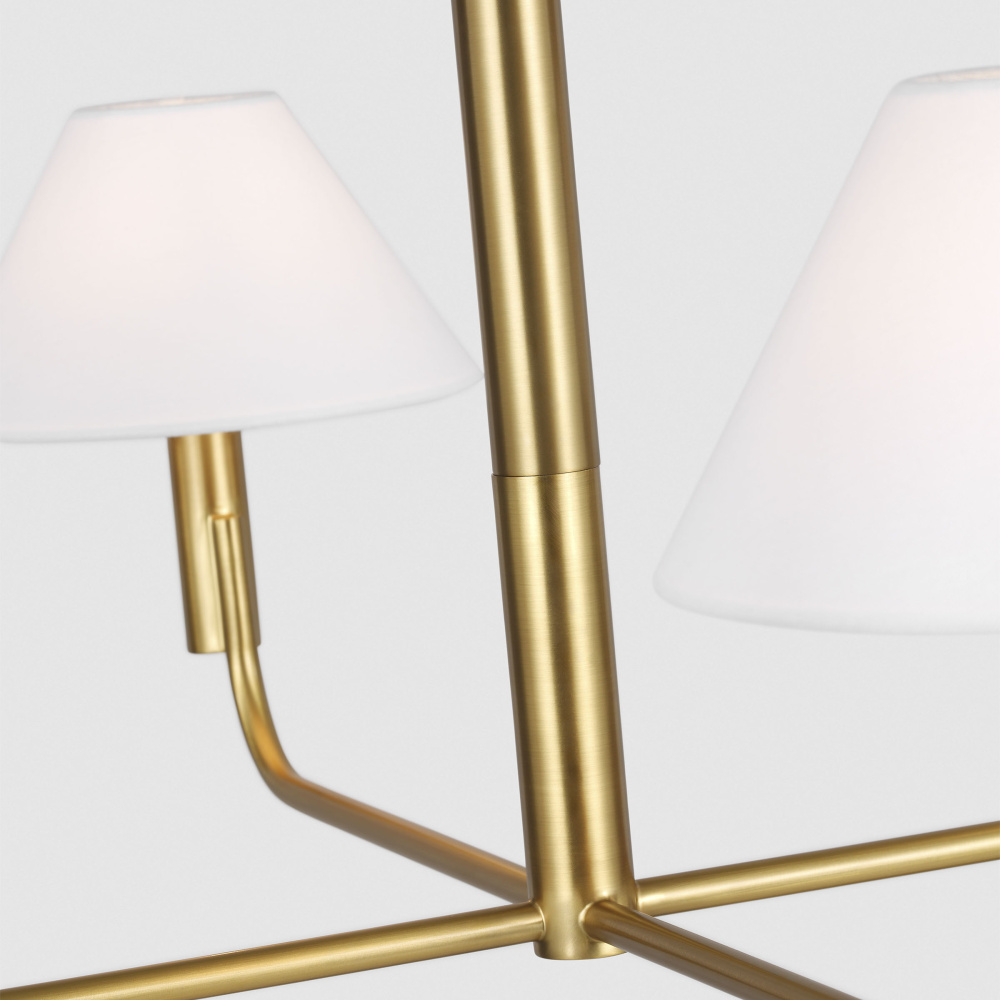 Elegant and modern the Colfax series by Sean Lavin features simple lines with unexpected details. From the stepped canopy to the offset candle tube and angled linen shades, the silhouettes will effortlessly accent interior decor styles of any aesthetic. The Colfax chandelier has a low, wide profile allowing it to hang in dining rooms of any size.