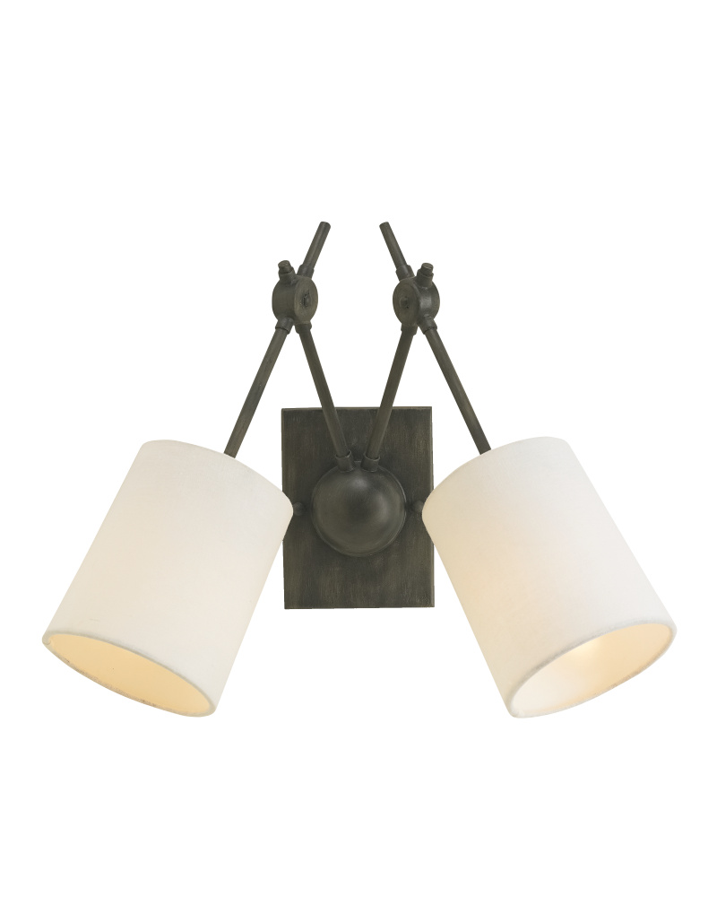 The angular arms and black Iron finish on the Compass Wall Sconce hold references popular during the Industrial Age. The rings that connect the arms on this black sconce have a machined feel to them, appearing as if they could raise the two white linen shades that angle away from each other.