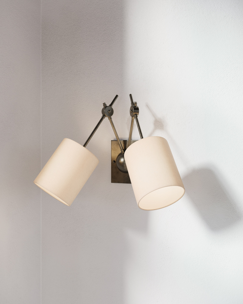 The spidery arms of the Compass Wall Sconce deliver its illumination with a great sense of direction. The architecturally inspired design of the frame lends it a rough luxe appeal, the warm Cupertino finish intermingling with the light cast through two white linen shades to create ample warmth. This fixture also comes in an aged brass finish.