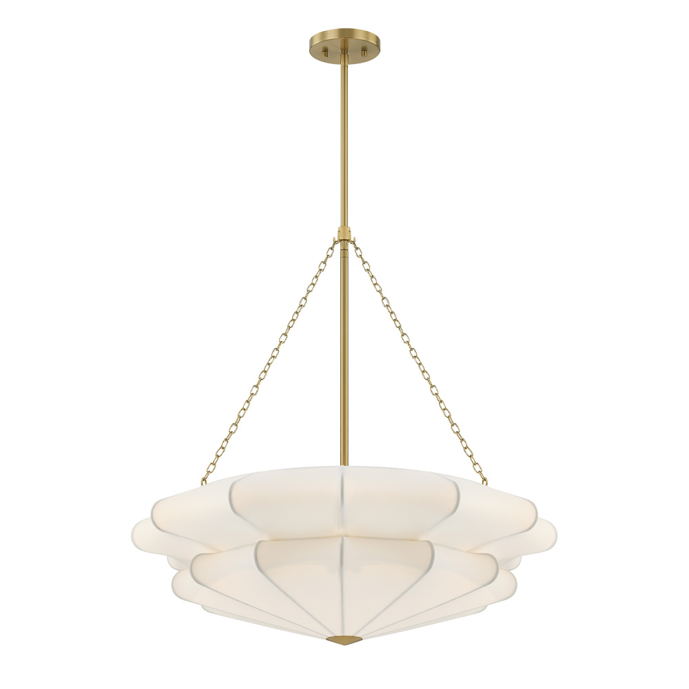 Softly elegant and beautiful, this Savoy House Coppell 3-light pendant is sure to add warm and welcoming illumination to any location. A two-tier white fabric shade opens gently outward, creating a soft silhouette and pairing nicely with the Warm Brass finish. Coppell is 28" in width and has an adjustable height ranging from 27.9" to 81.9". It uses three standard size bulbs of up to 60 watts per bulb. Bulbs not included. Comes with four 12" downrods and one 6" downrod.