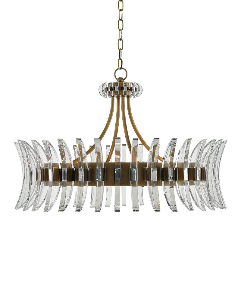 The Coquette Chandelier is a modern iteration of Art Deco artistry that intermingles the brilliance of slices of optic crystal and the depth of metal that has been treated to an antique brass finish. The crystal blades that line the round fixture read like half-moon slivers to bring the chandelier a warm/cool sense of glamour. The eight-light chandelier would bring a sophisticated sense of luxury to any number of rooms in the well-appointed home.