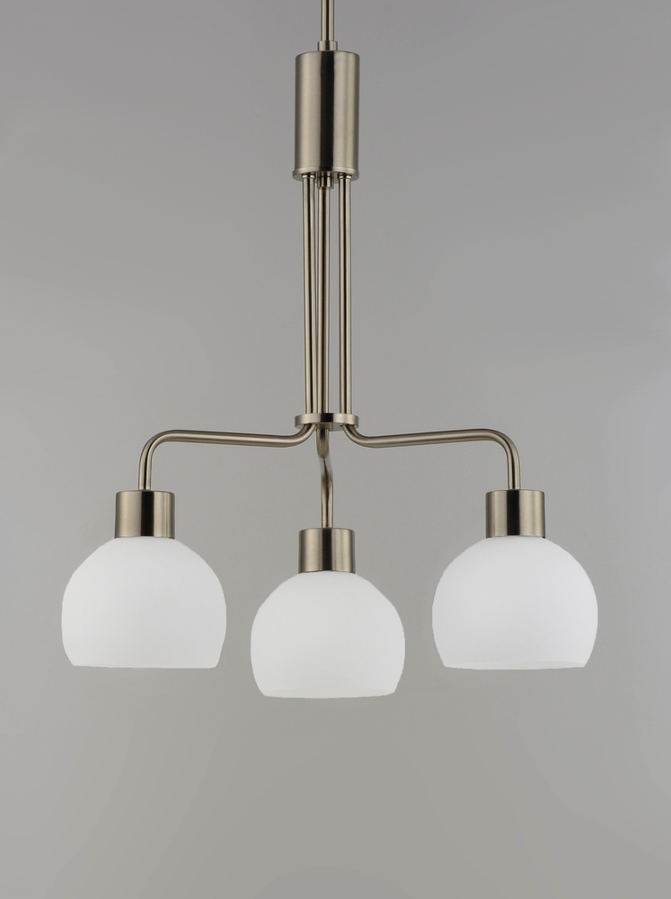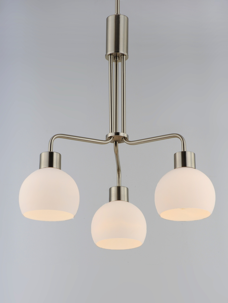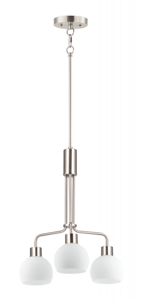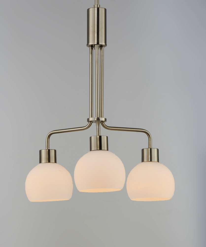 A charming collection of farmhouse inspired design. Satin White glass domes suspend from individually distributed tube arms. Available in Black, Satin Nickel, and a Bronze/Satin Brass combination. This transitional look offers an updated look for both trad