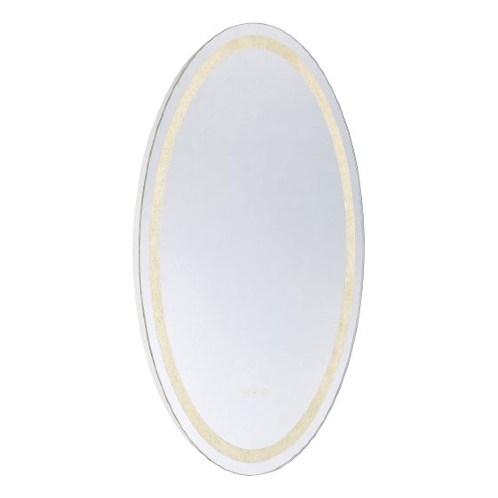 Lovers of glamorous style will find their perfect match in this Savoy House Cordova oval front lit LED mirror! Marvel at the thousands of tiny crushed crystals embedded in the frame that add sparkle to the space, whether the light is on or off, and find convenient controls right at your fingertips. Choose from three different color temperatures - 3000K, 4500K and 6500K - to get the glow that is right for you. Use the stepless dimmer to increase or decrease the brightness. Keep things clear with the defogger, which shuts off automatically after one hour. Cordova even remembers and recalls the last used illumination setting! This mirror is free from lead and copper, comes with mounting hardware and is backed by a 3-year warranty. Uses 40 watts to deliver 862 lumens at a CRI of 90+. Suitable for damp locations. Cordova is 36" in height, 24" in width and extends 1.88" from the wall. Can be mounted horizontally or vertically.