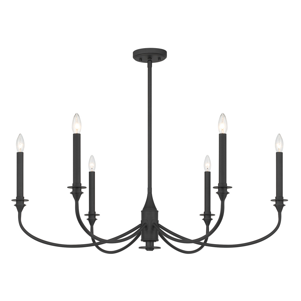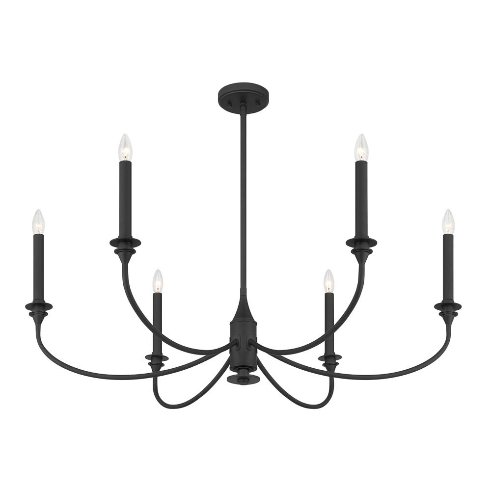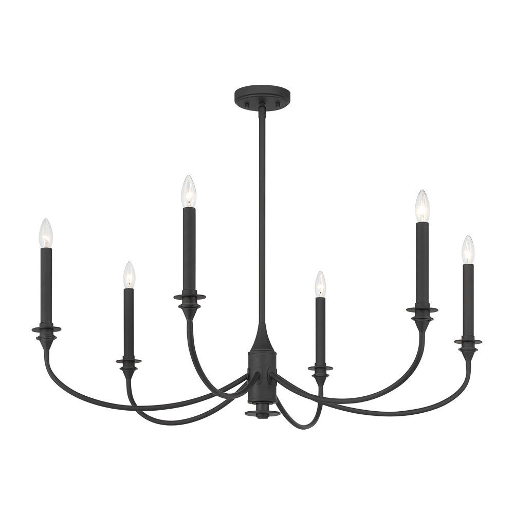 Bold and refined, the Savoy House Coventry 6-light chandelier brings a commanding presence to traditional and transitional spaces alike. Its gently curved arms and tall, tapering candle covers take on a dramatic edge in the Matte Black finish, giving the silhouette striking contrast and sculptural appeal. Coventry measures 40" in width and has an adjustable height ranging from 18.75" to 60.75". It uses six candelabra size bulbs of up to 60 watts each (not included). Four 12" downrods and one 6" downrod are included.