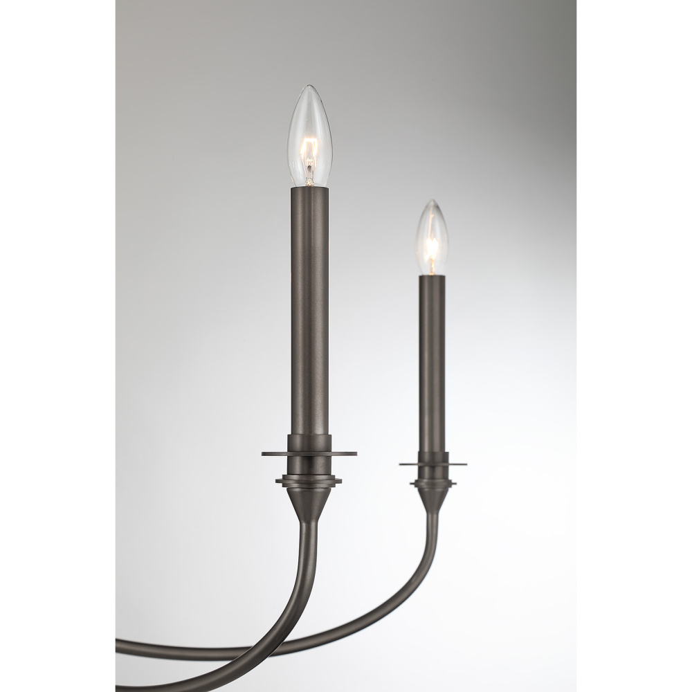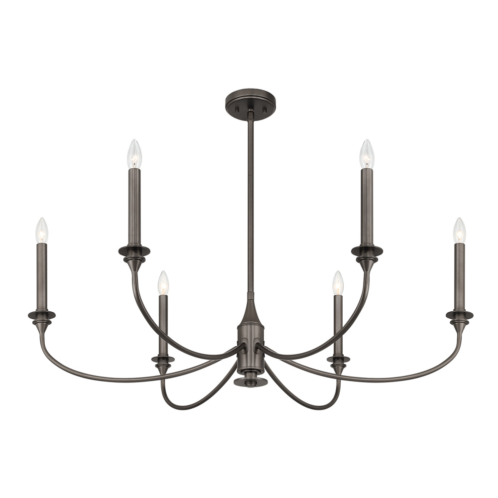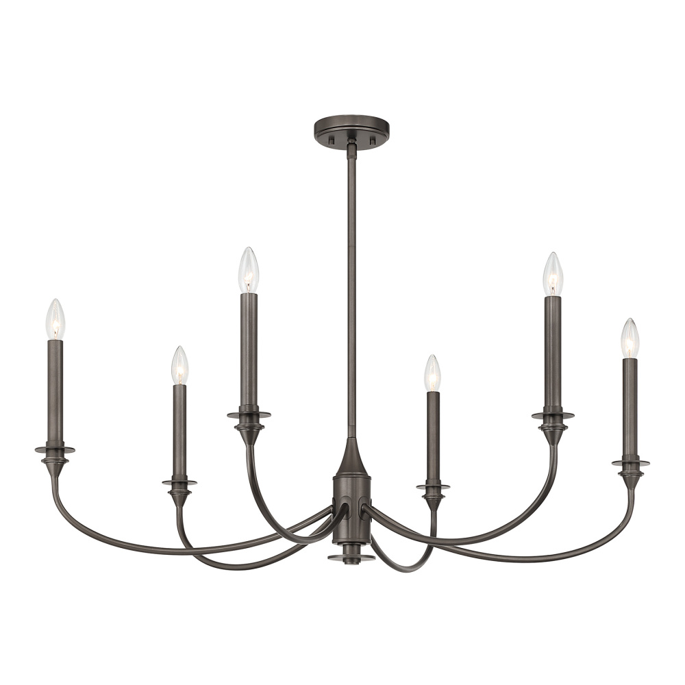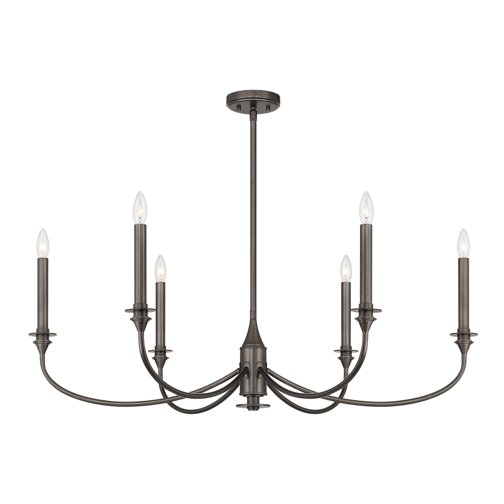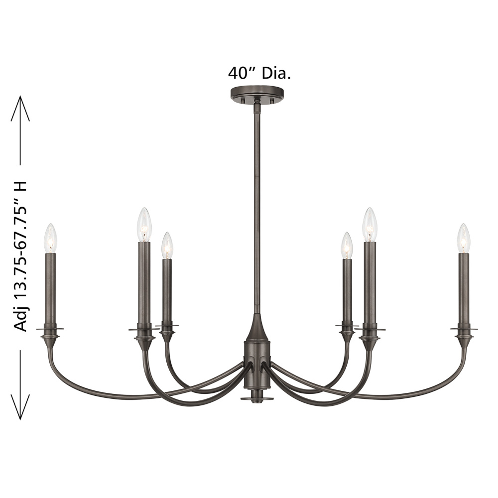 Rich and dramatic, the Savoy House Coventry 6-light chandelier becomes a beautiful centerpiece. The deep, burnished tone of the Mediterranean Bronze finish accentuates the graceful curves and tall candle sleeves, creating a look that feels traditional and warmly atmospheric. Coventry measures 40" in width and offers an adjustable height from 18.75" to 60.75". It uses six candelabra size bulbs of up to 60 watts each (not included). Four 12" downrods and one 6" downrod are included.