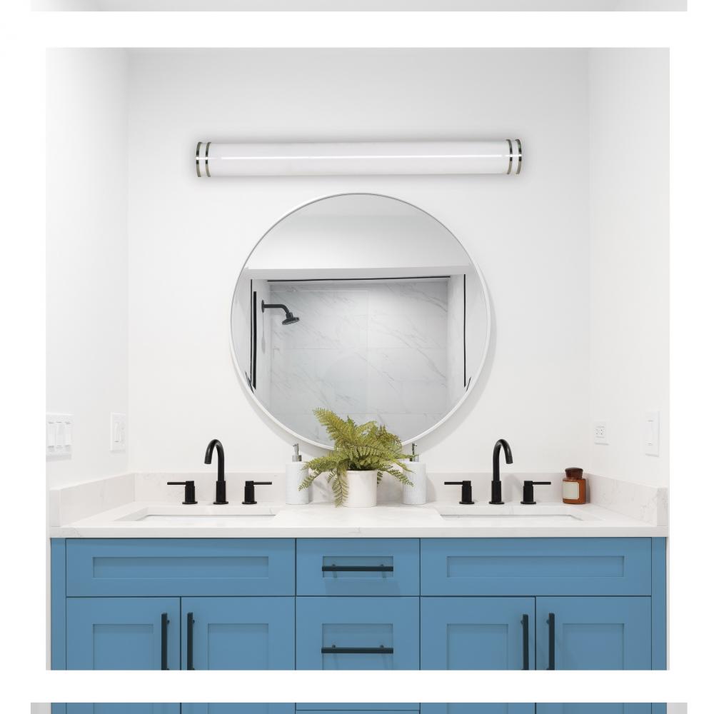 The SATCO NUVO 62-1873 Crispo 25-inch Vanity Fixture in All White features 5 CCT selectable technology (2700K–5000K) and 90 CRI illumination for vibrant color rendering. This 25-watt fixture replaces 200W incandescent lighting, providing energy-efficient