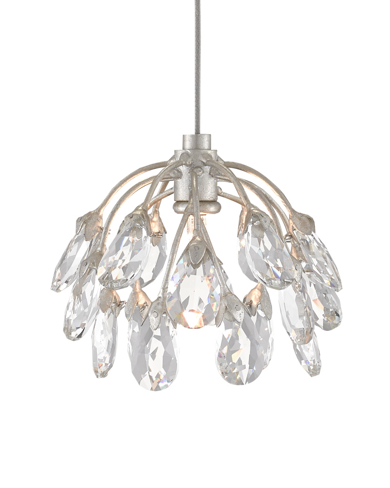 The Crystal Bud 1-Light Multi-Drop Pendant dangles a flower made of delicate faceted crystals from its canopy to make the shade effervescent and graceful. The canopy of this piece is luminous in a painted silver finish. This fixture is among Currey & Company's multi-drop pendant collection, which includes multiple configurations.