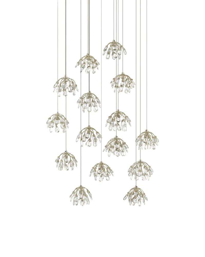 The Crystal Bud Round 15-Light Multi-Drop Pendant dangles flowers made of delicate faceted crystals from its canopy to make the shades effervescent and graceful. The canopy of this piece is luminous in a painted silver finish. This fixture is among Currey & Company's multi-drop pendant collection, which includes multiple configurations.