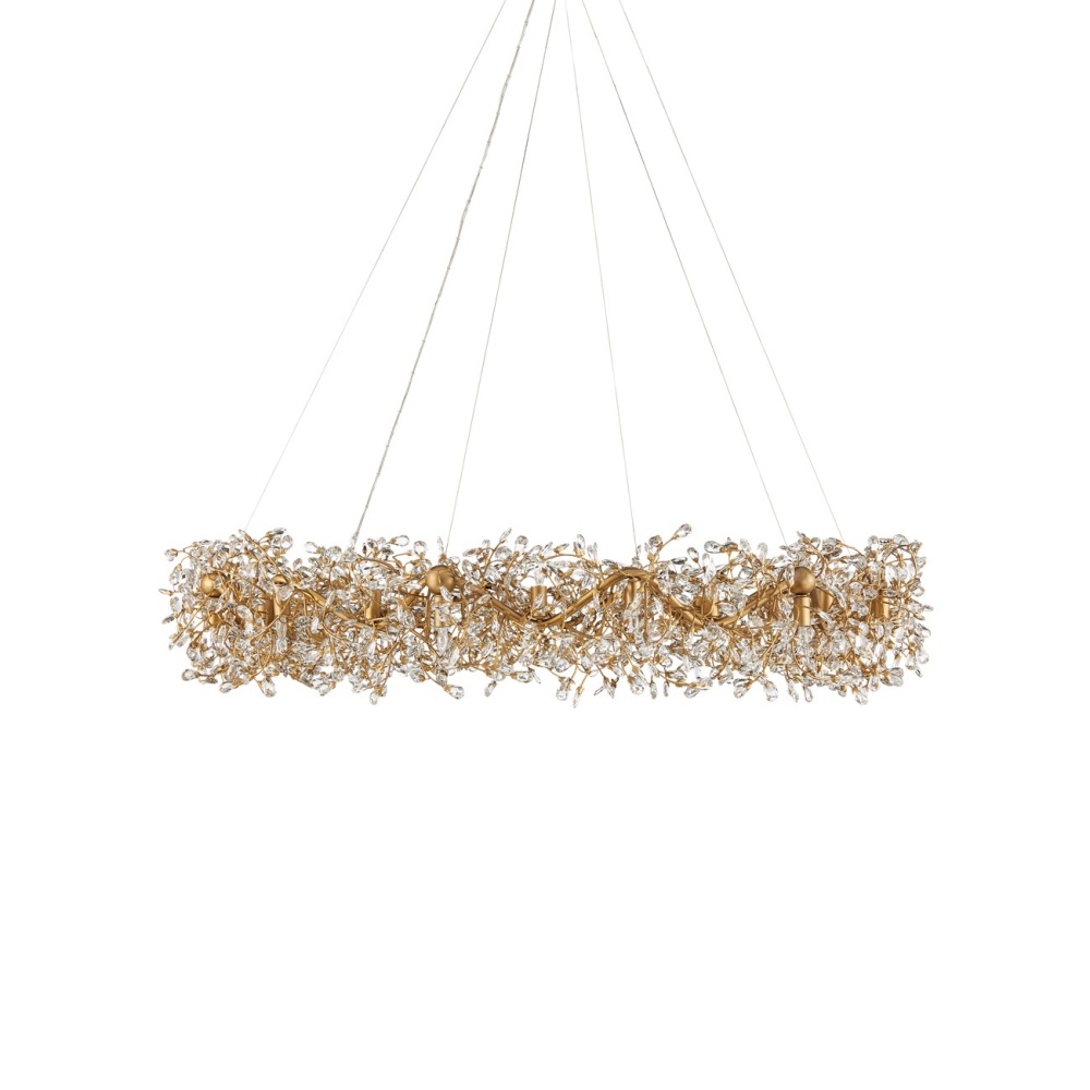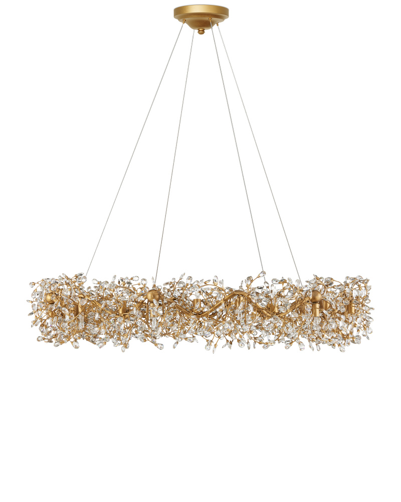 The Crystal Bud Grande Ring Chandelier has delicate faceted crystals unfurling from vines that flow around the fixture. The gleaming metal in a brass finish serves as a warm contrast to the luminous crystals; the interplay making the profile of this fixture complex and interesting. This stunning crystal chandelier is nearly 50 inches in diameter and the lights alternate pointing up and down to increase the sparkle and the luxurious aura. Adjustable from 36" to 102" with use of included chain/rod kit/cable. If your space calls for a longer drop, additional chain/rods/cable is available for purchase.