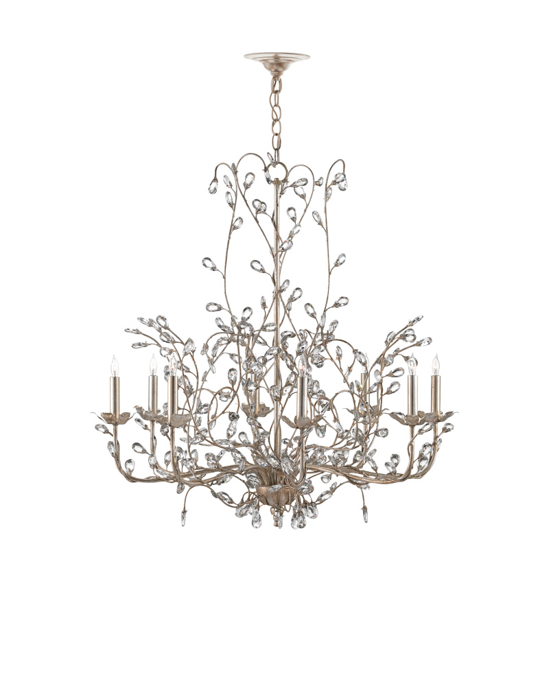 The pleasing attributes of nature merge with the conventions of finely crafted traditional design in the silver version of our romantic Crystal Bud Chandelier in a large size. Delicate faceted crystals unfurl from the silver Granello-finished vines that make up the flowing profile of this idyllic piece. The eight-light chandelier is one of the fixtures in our Crystal Bud family of lights.