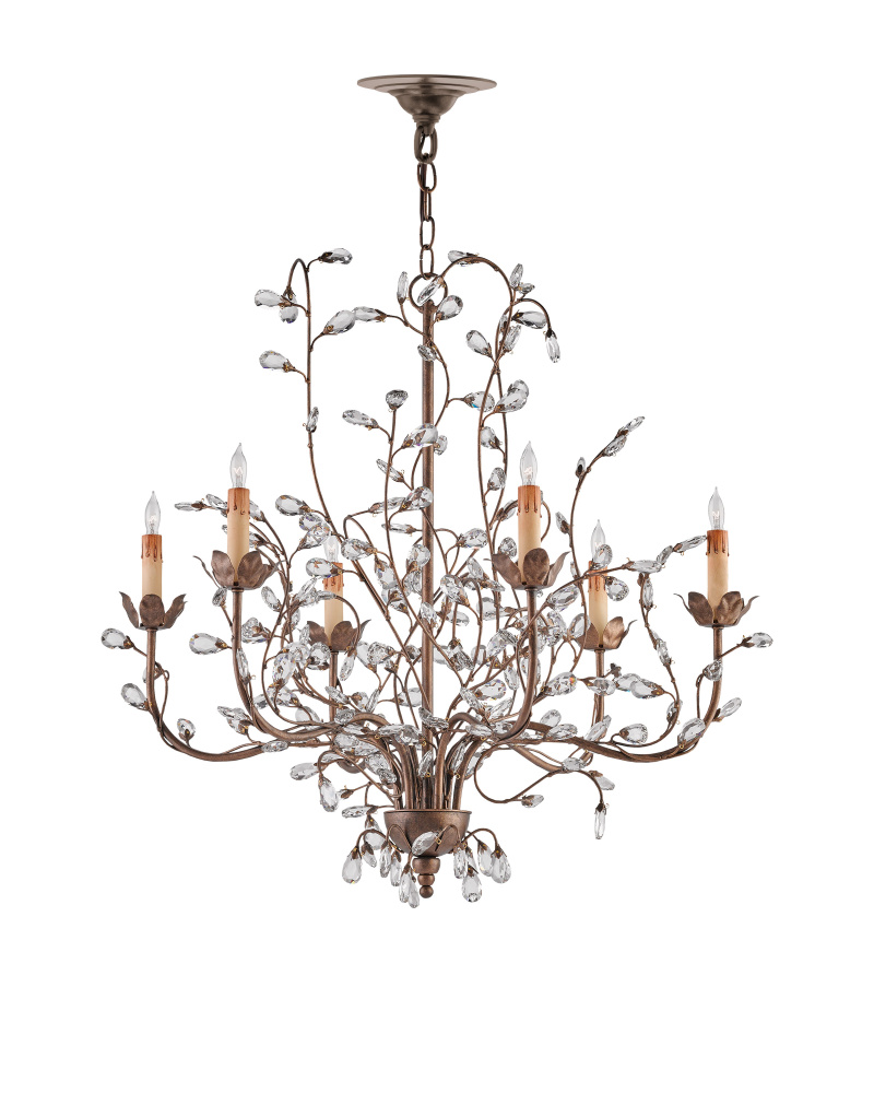 The pleasing attributes of nature merge with the conventions of finely crafted traditional design in the medium version of our romantic Crystal Bud Chandelier. Delicate faceted crystals unfurl from the Cupertino-finished vines that make up the flowing profile of this idyllic piece. The six-light chandelier is one of the fixtures in the varied Crystal Bud family of lights.