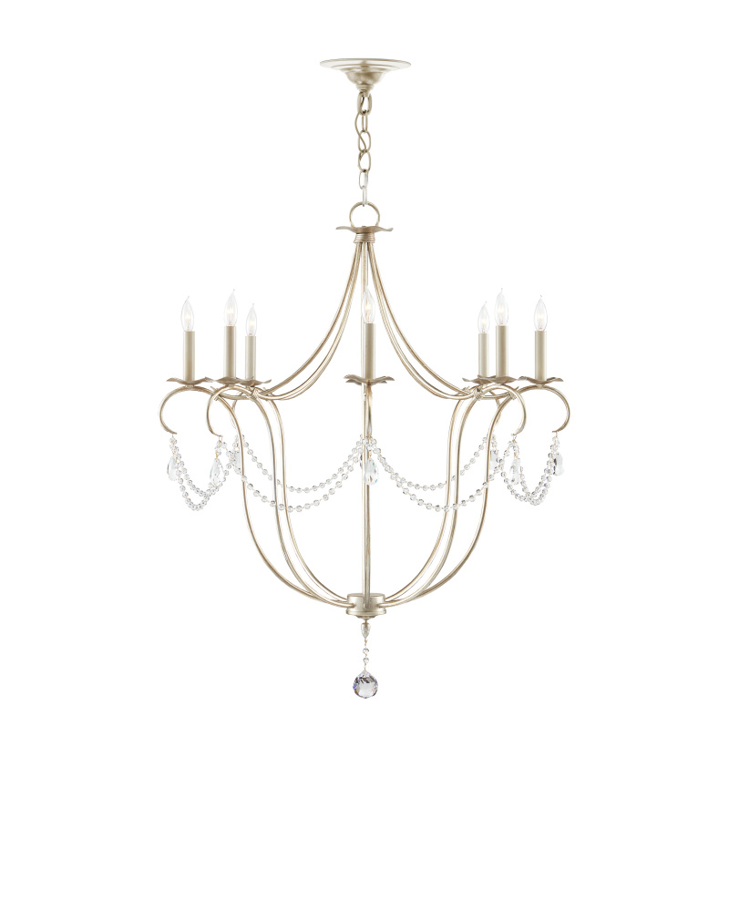The large version of our Crystal Lights Chandelier flaunts its jewelry fittingly, as its beads are far from mere ornamentation: they are essential to the heart of this design. The crystals swag between elegant wrought-iron spokes that curl daintily at the ends. Wires bind the curling supports to those cascading from the canopy for added cohesion in the design details, all treated to a silver leaf finish. We see the fixture with its eight candelabra bulbs as the perfect bauble for the glamorous dining room or living room.