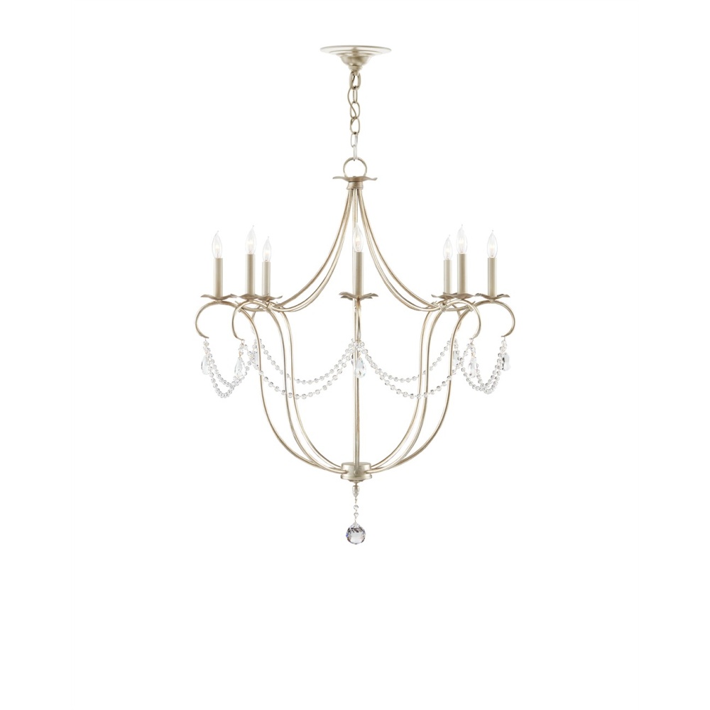 The Crystal Lights Silver Large Chandelier drips with crystal beads that swag between wrought iron curls in a silver leaf finish. These support lovely teardrop pendants. The silver chandelier balances its candelabra bulbs on bobeches sitting atop its slender arms. The Crystal Lights family includes a number of designs in a variety of finishes. Adjustable from 43" to 110" with use of included chain/rod kit/cable. If your space calls for a longer drop, additional chain/rods/cable is available for purchase.