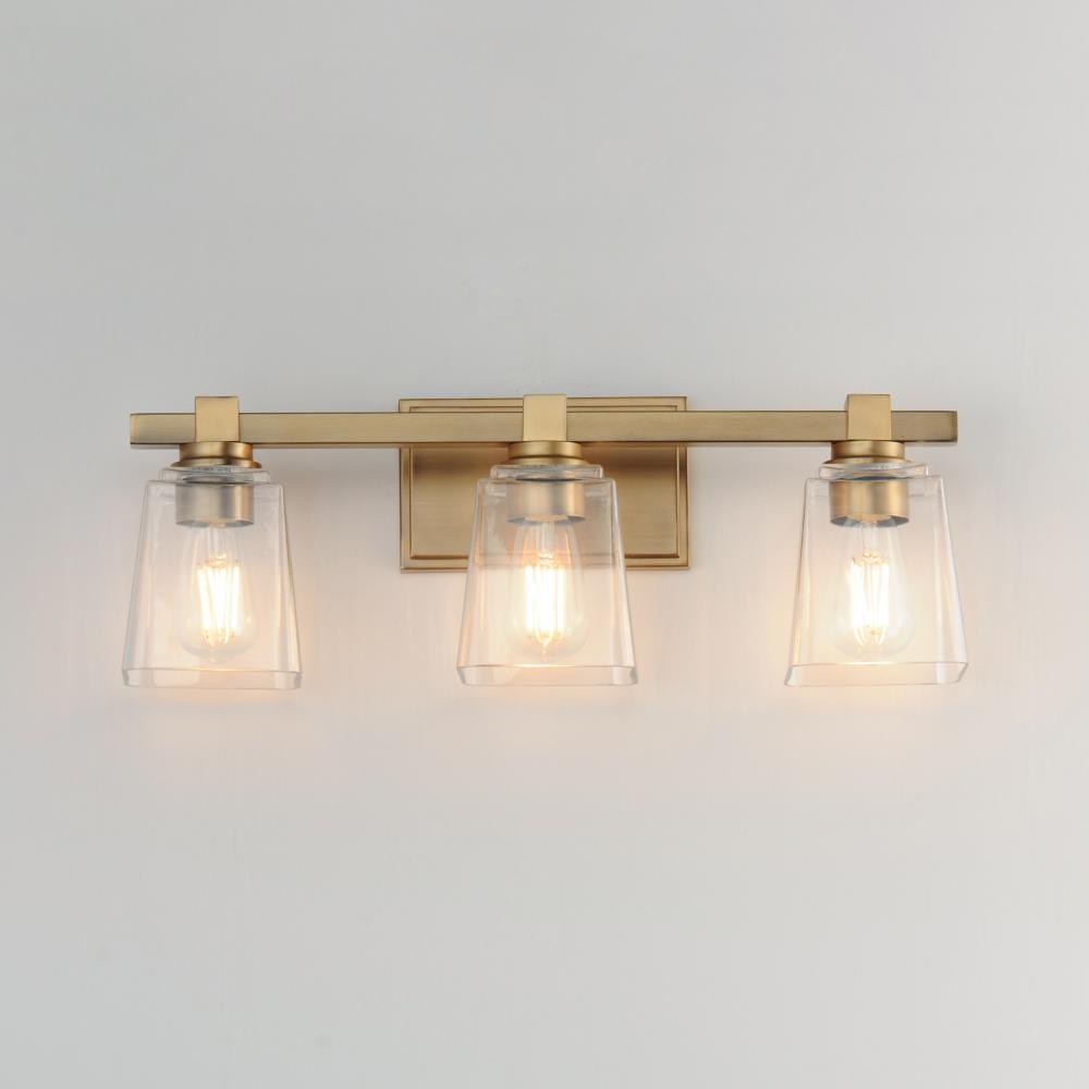 A composition of square forms that feature a Clear tapered square glass shade, these bath vanities provide a transitional design that suits both modern and traditional spaces. Available in Matte Black, Polished Chrome, Satin Nickel, and Natural Aged Brass.