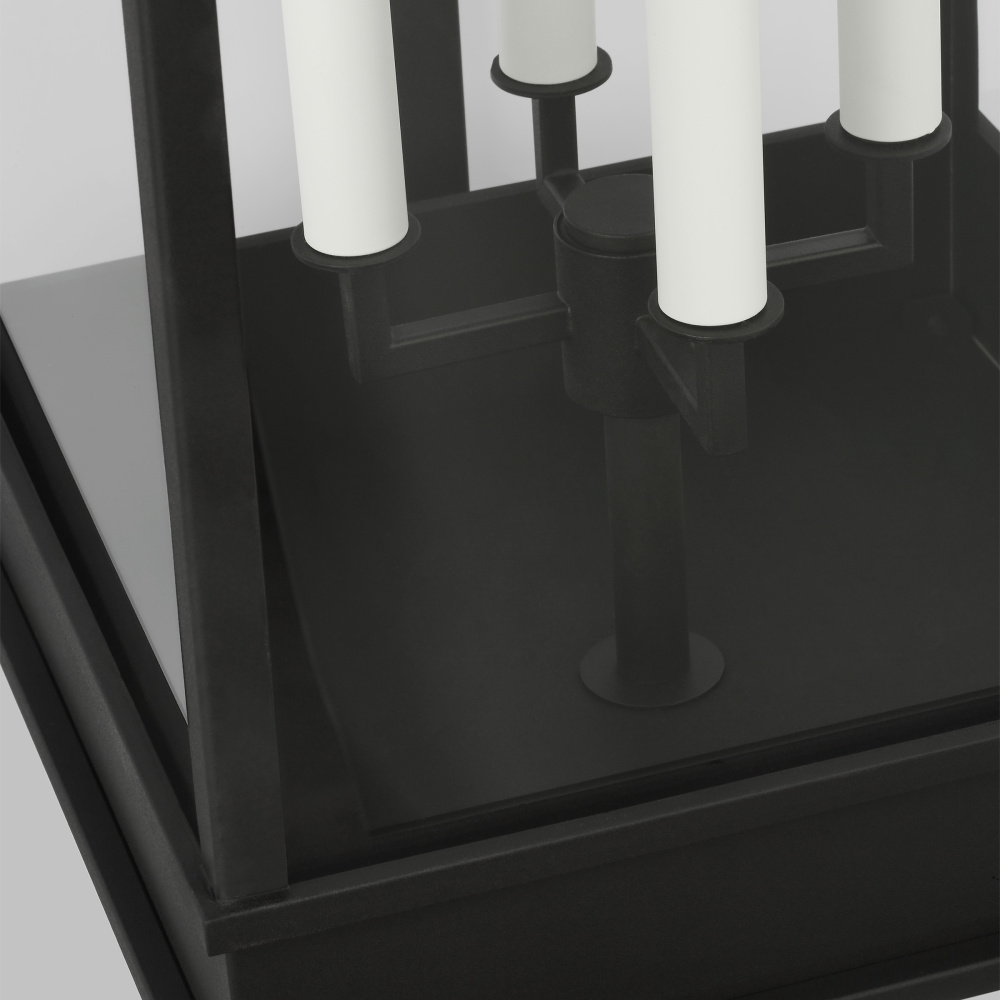 The Cupertino outdoor series by Chapman & Myers was created to embody a more transitional classic rectangular lantern profile. Rather than feature filament tube bulbs, each lantern has a more traditional candelabra with cream candle tubes to complete the design. The top and bottom of each lantern have an almost architectural stepped detailing.