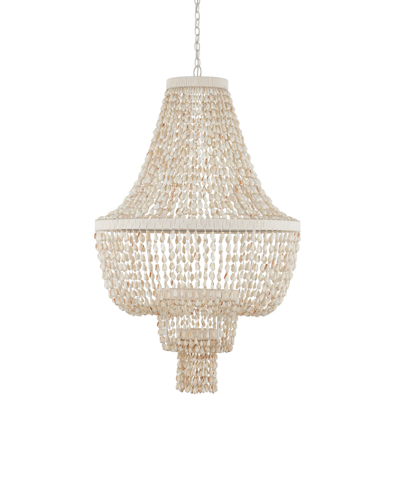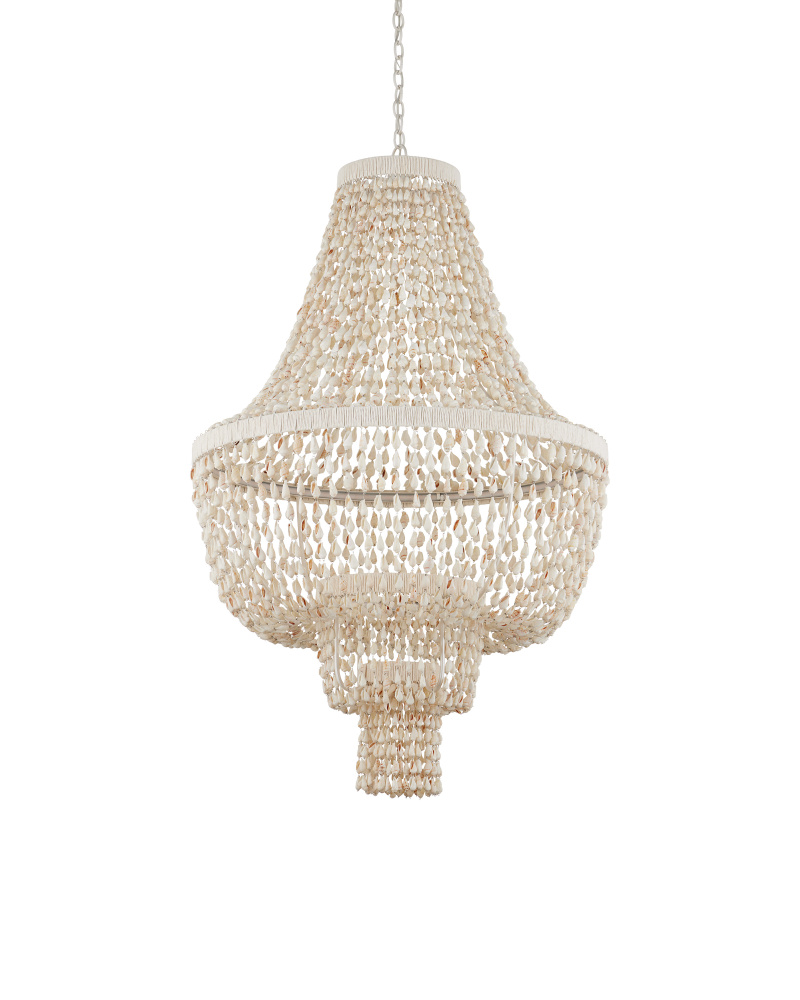 The graceful Cybele Chandelier is an artistic statement made of natural materials styled in a sophisticated way that transcends the humbleness of each of its building block. Natural shells are draped in the time-honored empire shape that has continued to be popular since the grand age of Hollywood Glamour. The wrought iron rings that support the swags are finished in pearlized white before being painstakingly wrapped in white paper twine. The paleness of both the finish and the twine tease out the lightest shades in the delicate shells. Adjustable from 65" to 156.5" with use of included chain/rod kit/cable. If your space calls for a longer drop, additional chain/rods/cable is available for purchase.