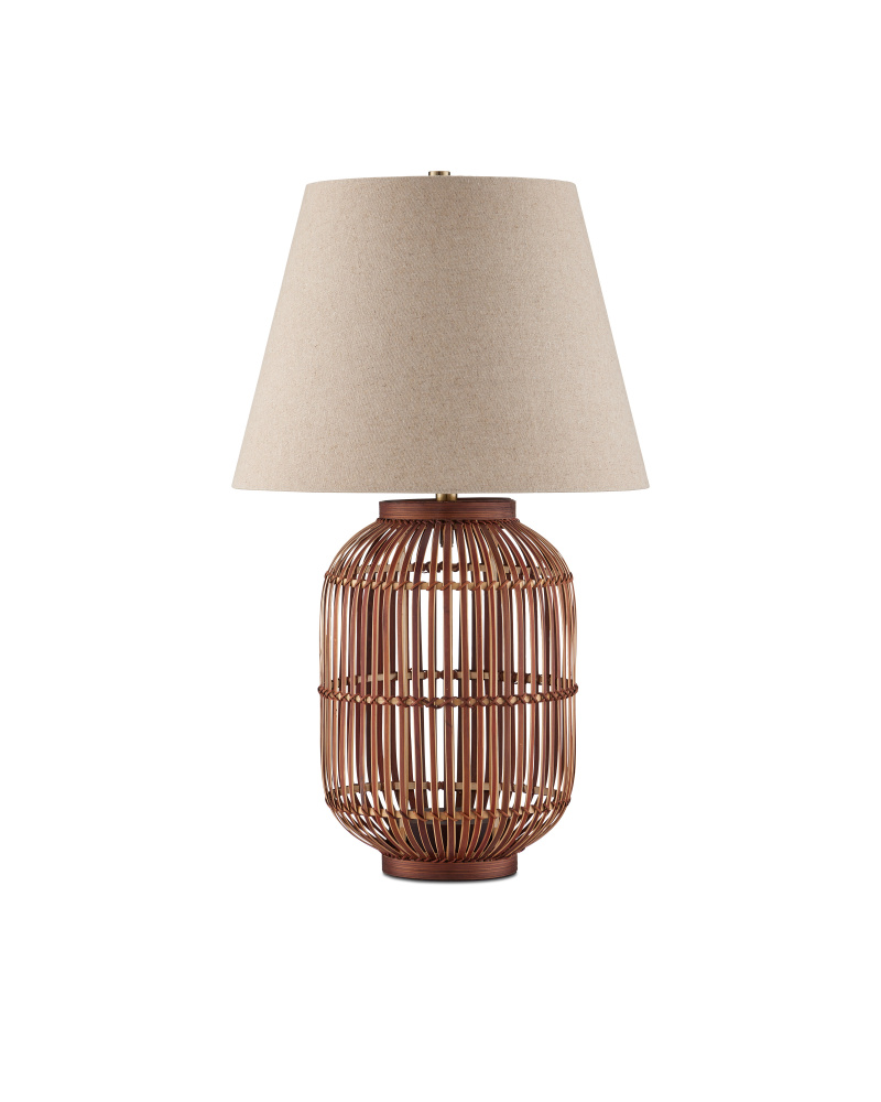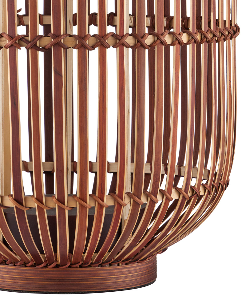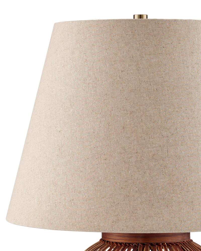 The Cyrus Table Lamp has a Japanese-lantern shape that was formed when strands of bamboo were split, polished, and tied in place with thinner strips. The light/dark interplay that brings the lamp interest is inherent in the natural material. The open weave with spacing between the reeds brings the brown table lamp an uptick in texture.