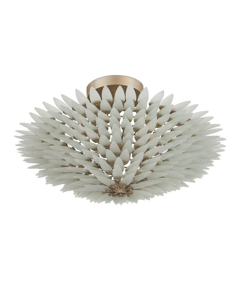 The Dahlia Semi-Flush Mount has a tiered design with spiky, leaf-like elements hand-cut from glass bottles. Each glass piece is secured to the wrought iron frame with flower-shaped brads that serve as a refined detail. Once shaped and polished, the petals are affixed to the frame in a contemporary silver finish to blossom on the ceiling when illuminated.