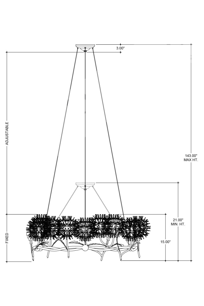 The Dandelion Silver & Gold Chandelier is a masterful composition that celebrates its namesake flower. The puff-balls that surround the bulbs are made of nails that are bent and welded together, a process that is extremely labor intensive. Made of wrought iron, the chandelier's undulant rings, orb accents, and leaves are in a contemporary gold leaf finish, while the floral elements are in a mix of contemporary silver leaf and contemporary silver finishes. This special piece expressively celebrates nature. Adjustable from 21" to 143" with use of included chain/rod kit/cable. If your space calls for a longer drop, additional chain/rods/cable is available for purchase.