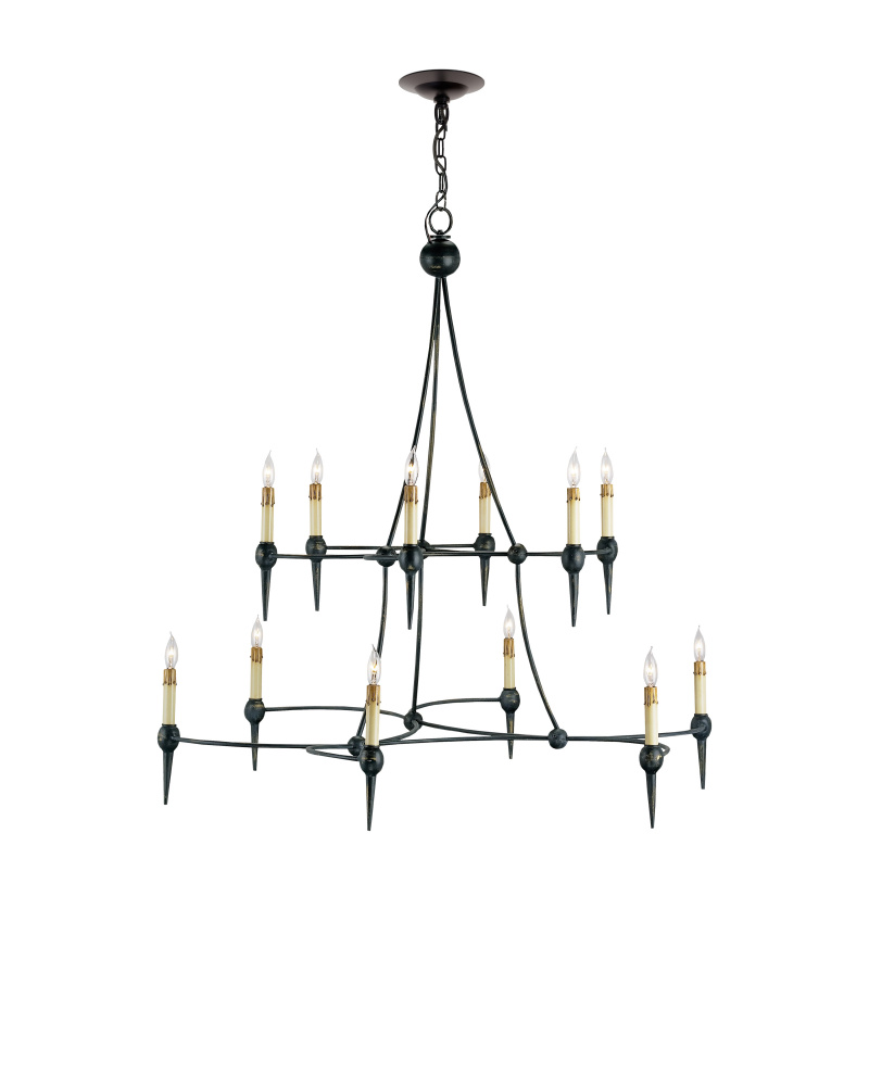 Like intersecting planets involved in their orbits, the U-shaped wrought iron arms of the two-tiered Danielli Chandelier gracefully converge as the overall design tapers to raise twelve points of light skyward. A French black finish serves as a sophisticated element of the design of this fixture, which measures 41 inches wide by 36 inches deep by 42 inches high.