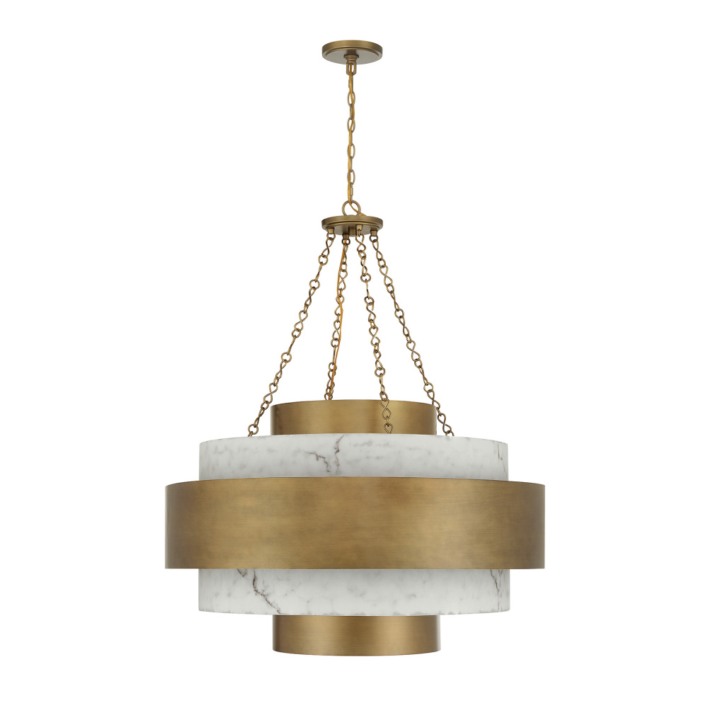 Inspired by glamorous Art Deco influences, the Savoy House Davenport 8-light pendant brings refined drama to any room. Bands finished in Antique Patina encircle panels of lifelike faux alabaster, creating a rich, dimensional effect that glows beautifully from within. Davenport is 43" in height and 36" in width. Uses eight candelabra size bulbs of up to 60 watts per bulb. Bulbs not included. Comes with 120" of chain.
