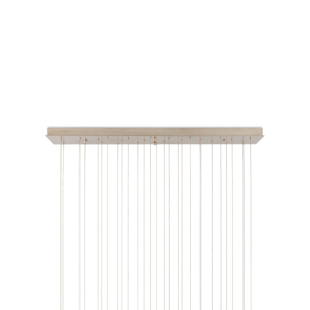 When a soft glow is desired, milk glass is one of the finest materials for diffusing light. The Daze 30-Light Multi-Drop Pendant features articulated panels of white milk glass joined by metal ribs in an antique brass finish. This brass and white multi-drop pendant transforms into a radiant centerpiece when illuminated. The canopy is finished in a luminous painted silver, adding to its elegance. This fixture is part of Currey & Company's multi-drop pendant collection, which offers a variety of configurations.