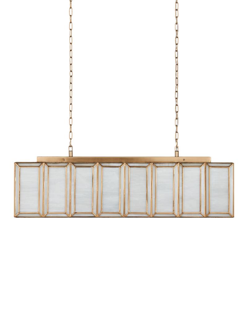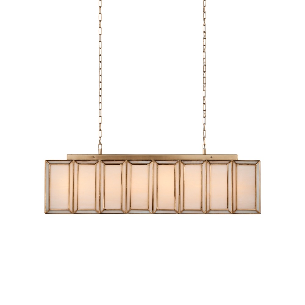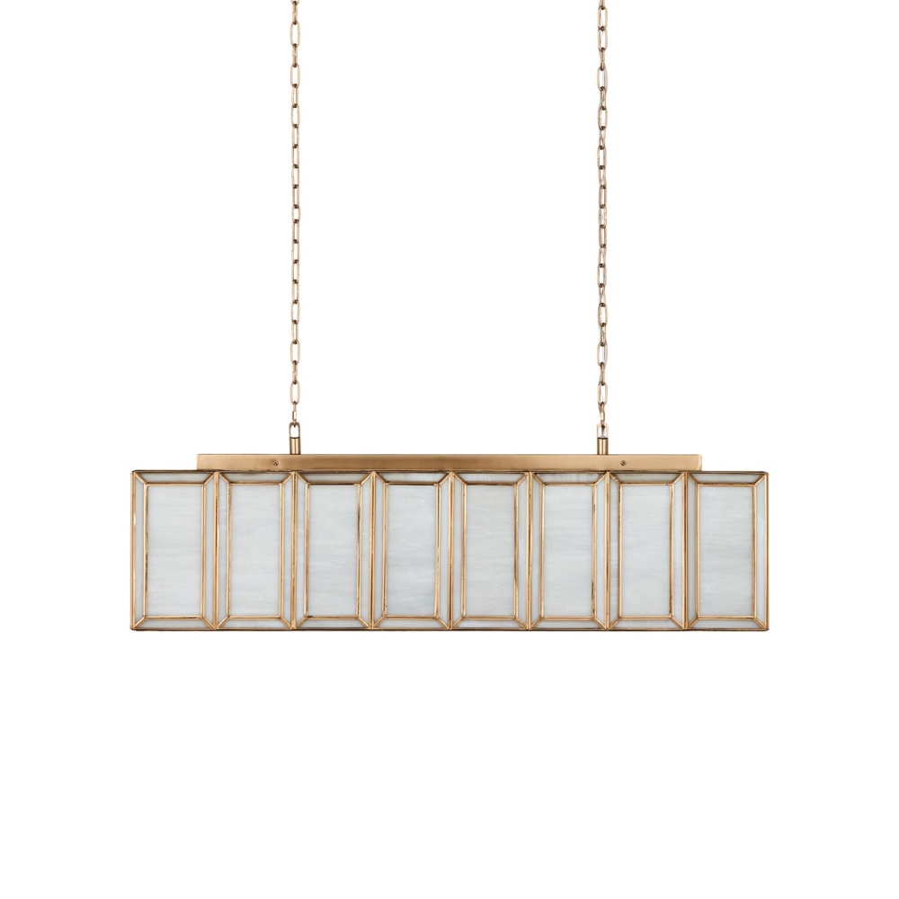 When a soft glow is desired, milk glass is one of the best materials to diffuse illumination. Our Daze Rectangular Chandelier is made of articulated panels of white milk glass that are joined together by ribs of metal in an antique brass finish. This white chandelier will turn luminous when it is switched on and will bring ample illumination to a long dining table or a kitchen island. Adjustable from 19.5" to 87.5" with use of included chain/rod kit/cable. If your space calls for a longer drop, additional chain/rods/cable is available for purchase.