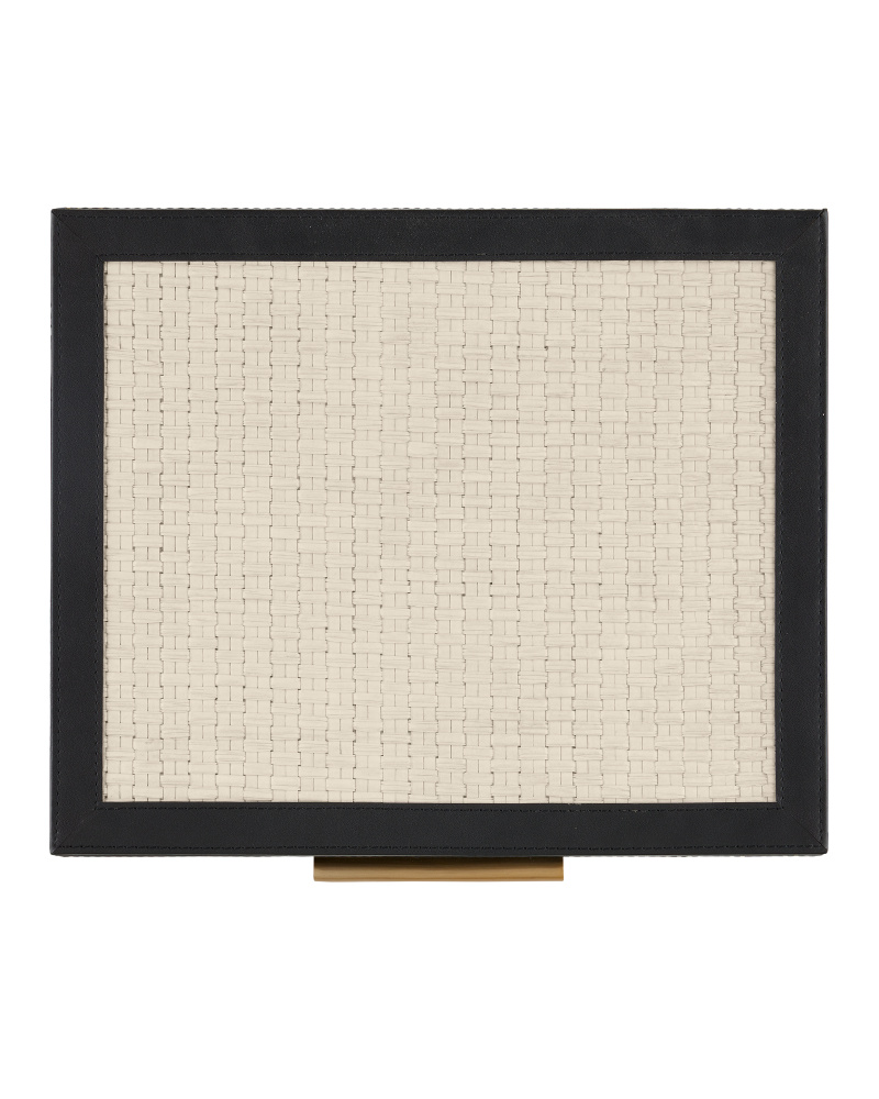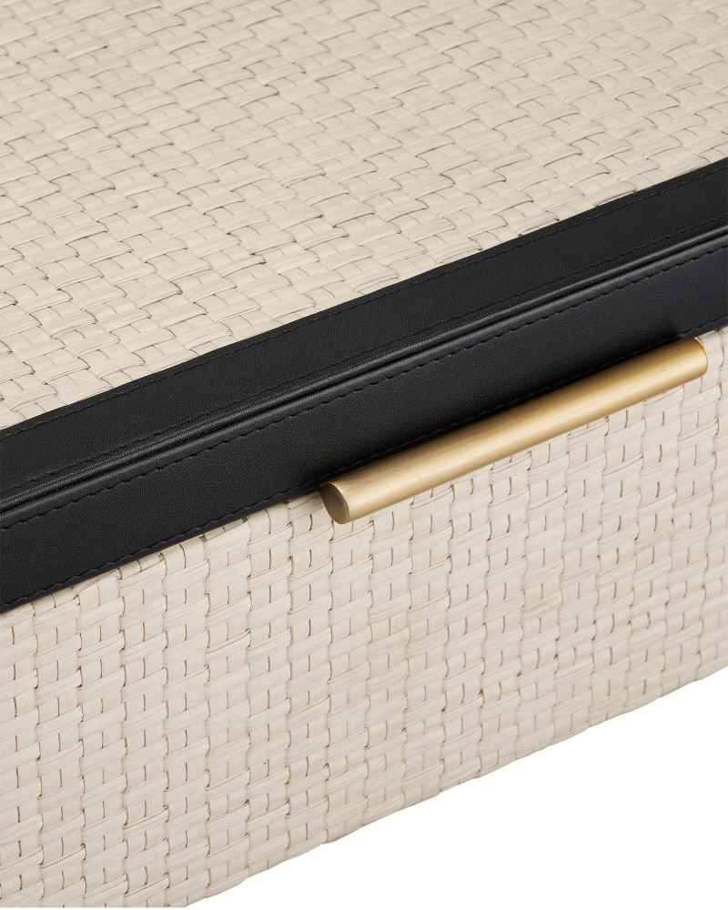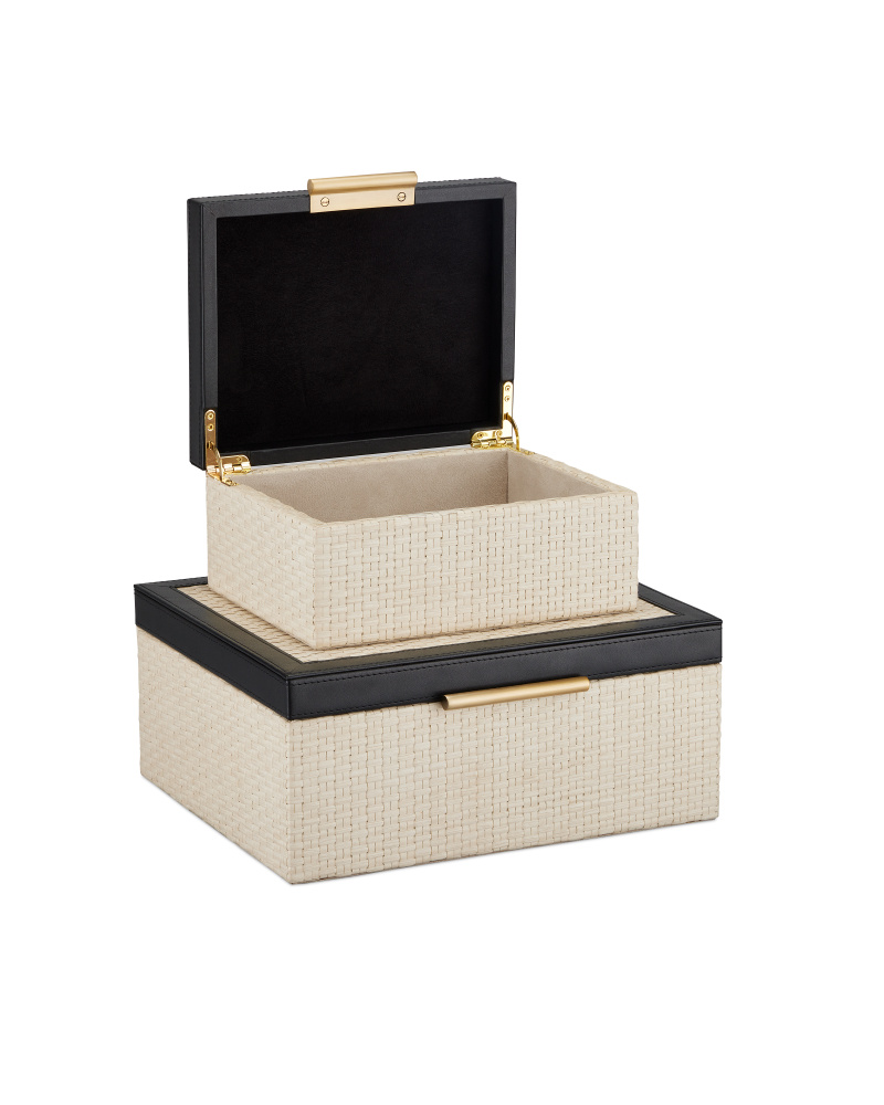 Made of intricately woven ivory raffia, the Deanna Box Set includes two sizes of decorative boxes with black leather tops, and light antique brass handles and hinges. The interiors of these black and ivory boxes are lined with beige micro suede for a luxurious feel. The uniformity of the weave on these boxes is created during a painstaking artisanal process.