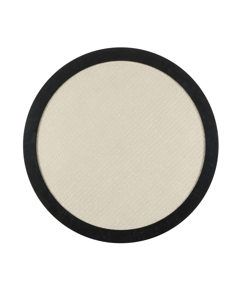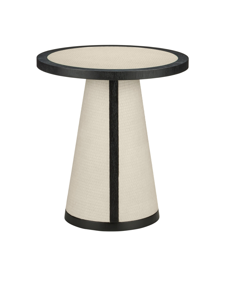 The pedestal of the Deanna Raffia Accent Table has three panels of woven raffia trimmed in Okoume wood veneers in a black finish that flow up to the circular top, also clad in raffia surrounded by a black wood detail. The combination of black and beige bring this accent table a tailored feel that fits within a wide spectrum of design styles, especially a room that exudes Hollywood glamour. The subtle texture of the raffia is a special aspect of this design, as is the fact the table is fitted with an inset glass top to protect the natural fibers.