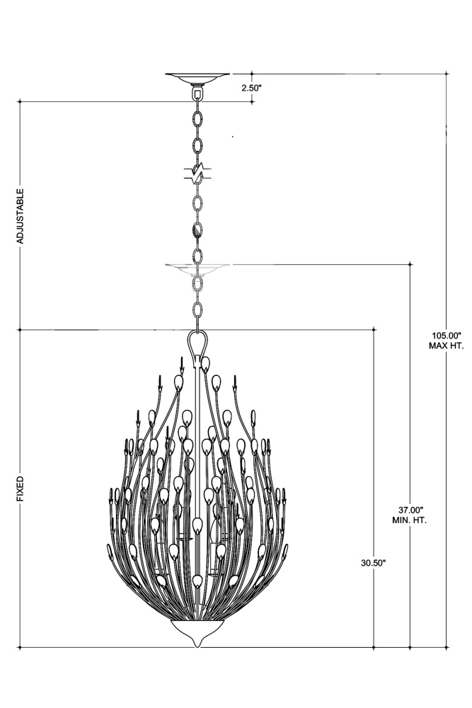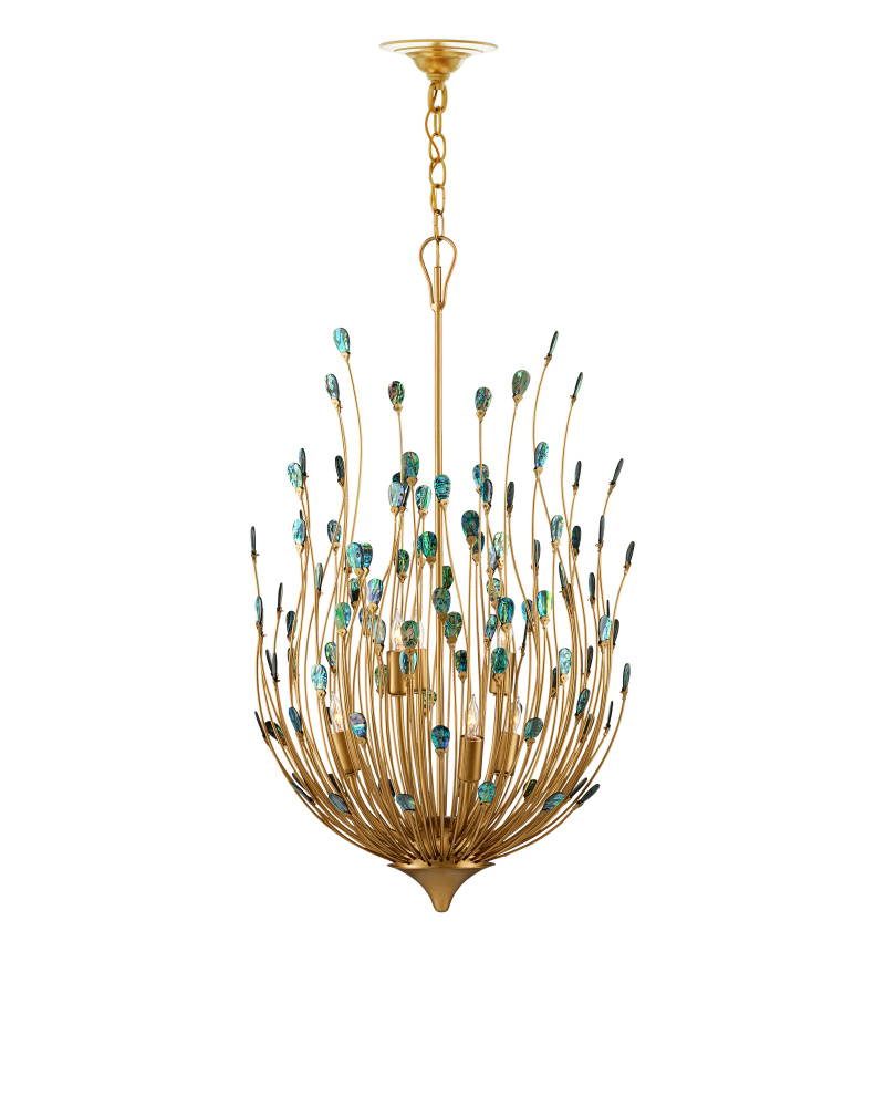 The teardrop-shaped Delphos Chandelier is inspired by birds and feathers; the fixture flows gracefully and evokes the elegance of a peacock’s tail. Beautifully crafted from wrought iron in a contemporary gold finish, the nature-inspired piece is ornamented with double-sided, highly polished New Zealand Paua Shells. This is a painstaking piece to realize, as the rods are bent by hand into the undulant composition and the luminous shells are hand-placed. The turquoise and gold chandelier will bring lively color to an interior thanks to the variations in the iridescent hues within each of the ornamenting shells. Adjustable from 37" to 105" with use of included chain/rod kit/cable. If your space calls for a longer drop, additional chain/rods/cable is available for purchase.