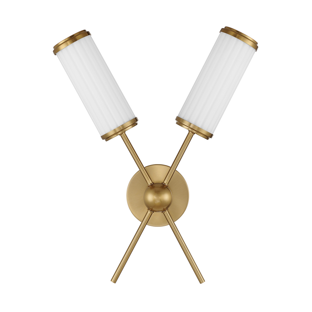 Designed by award-winning interior designer Dann Foley, the Savoy House Denison 2-light sconce brings warm, inviting artistry to any space. Two crossed arms finished in Warm Brass support elegantly ribbed shades of opal white glass, creating a refined glow that instantly elevates the room. Denison is 20" in height, 15.75" in width and extends 4.75" from the wall. It uses two candelabra size bulbs of up to 60 watts per bulb. Bulbs not included. Damp area rated.