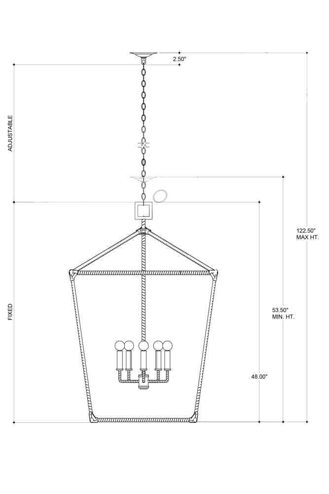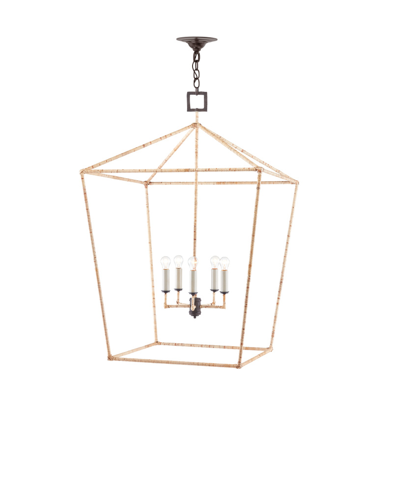 The Denison Grande Natural Lantern is a hammered wrought-iron fixture in a Mole black finish that is wrapped in rattan. The classic lantern shape has stood the test of time to make it one of our most popular offerings. A design element of note is the square that fastens the lantern to the chain. Adjustable from 53.5" to 122.5" with use of included chain/rod kit/cable. If your space calls for a longer drop, additional chain/rods/cable is available for purchase.