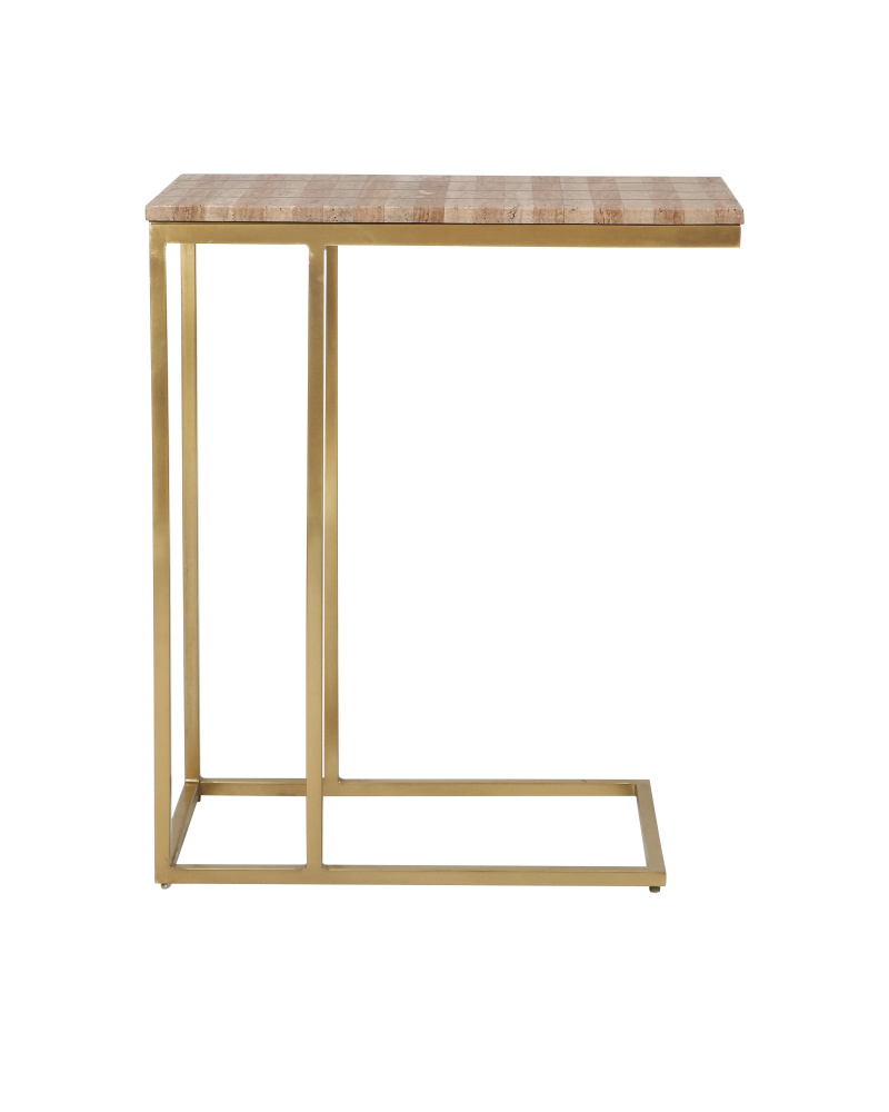 The Dezi C Table has a top set with natural travertine tiles arranged in a stacked dark-and-light pattern with lines of brass inlay running throughout. The effect of the intermingling of materials is a pop of brightness as the natural light shines on the metal and a hint of warmth as the stone absorbs it. The top on the gold cantilevered table is supported by a clean-lined frame made of iron that rises from a slightly smaller base.