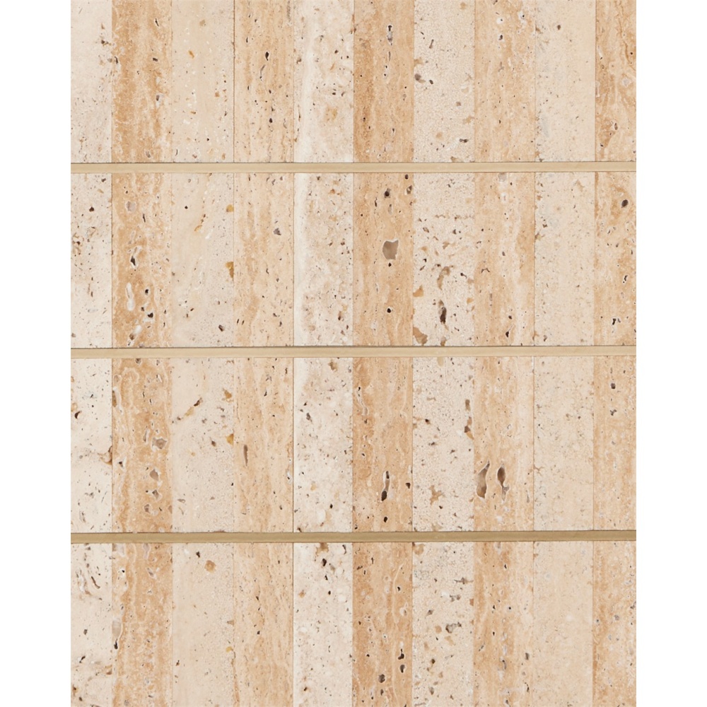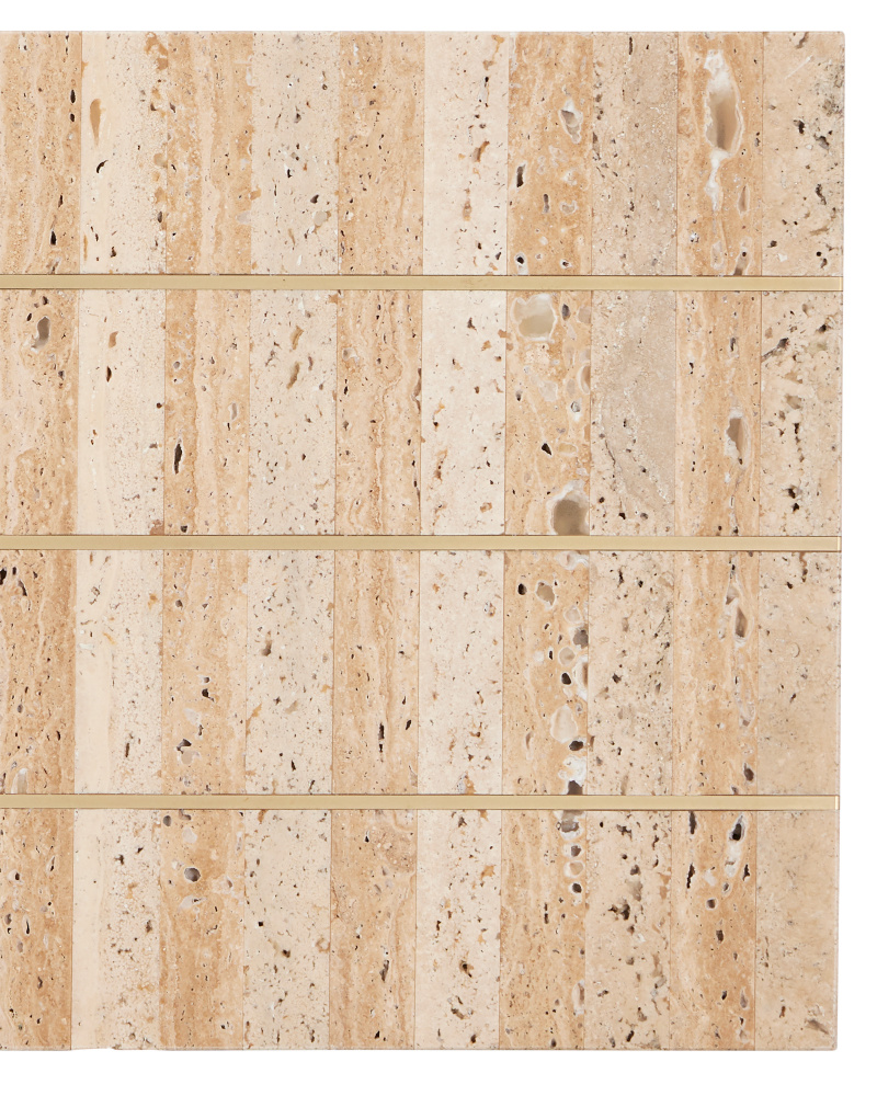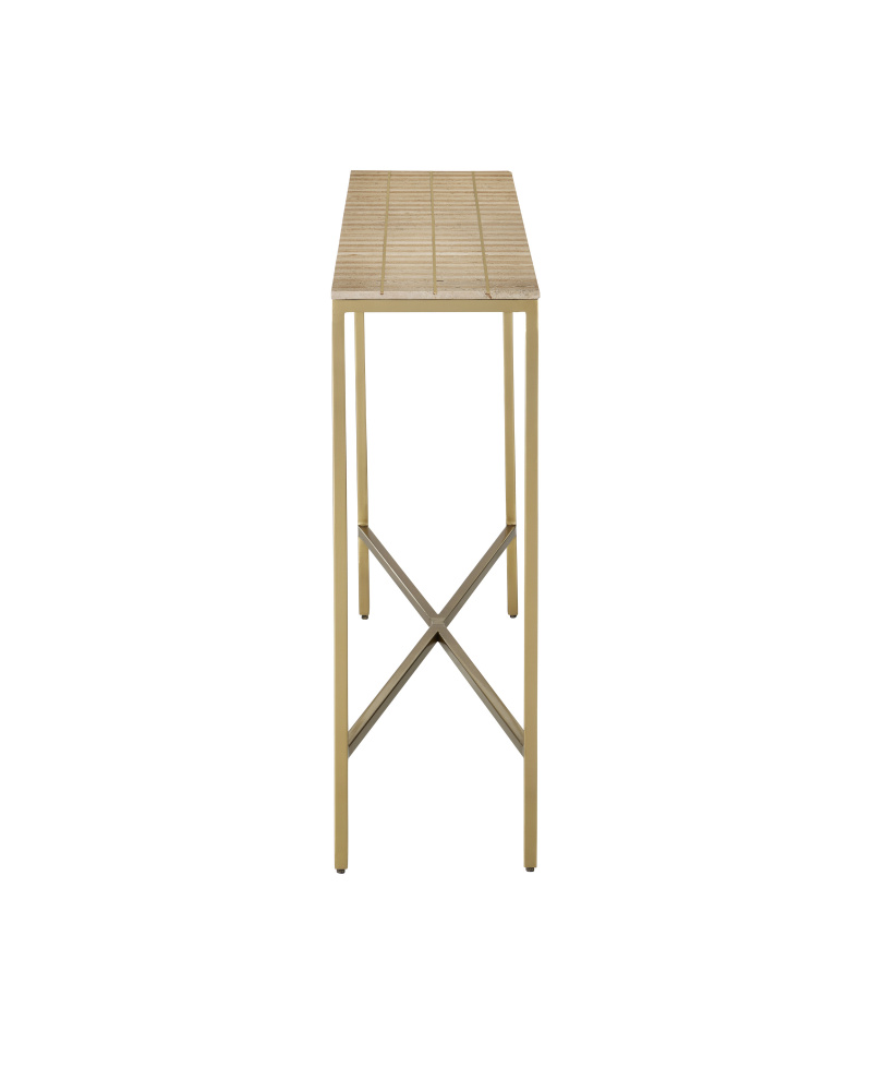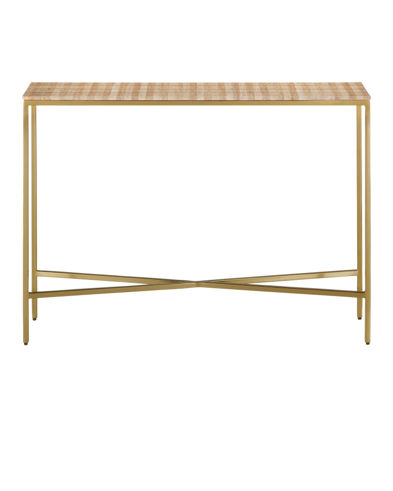 The Dezi Console Table has a top set with natural travertine tiles arranged in a stacked dark-and-light pattern with lines of brass inlay running throughout. The effect of the intermingling of materials is a pop of brightness as the natural light shines on the metal and a hint of warmth as the stone absorbs it. The top on the gold console table is supported by clean-lined legs that are made of iron and connected by an x-shaped stretcher.